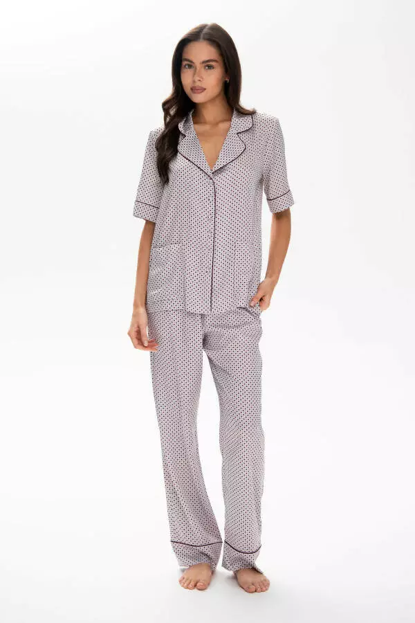 Комплект складається з двох частин: кофти з коротким рукавом та шортів. Кофта має стильний кант, що додає їй елегантності та робить її вигляд особливо вишуканим. Короткий рукав забезпечує легкість та комфорт у теплі літні ночі, дозволяючи вашій шкірі дихати. Шорти мають зручний еластичний пояс, що гарантує ідеальну посадку та максимальний комфорт під час носіння. Їх вільний крій дозволяє відчувати себе вільно та невимушено, що особливо важливо для комфортного сну.