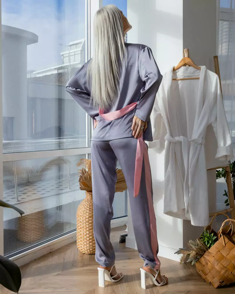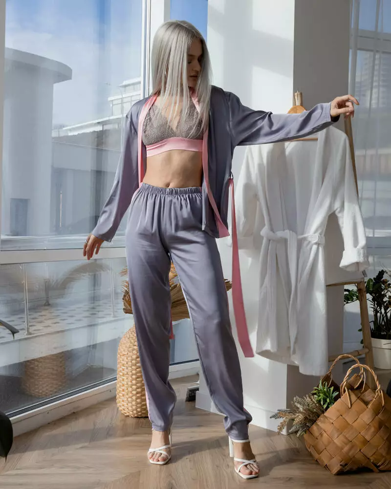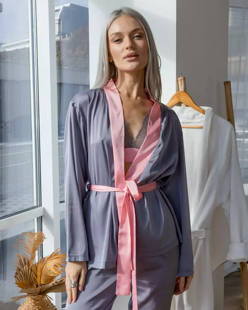 Ніжний шовковий піжамний костюм, який не хочеться знімати! Комплект: витончений мереживний топ, що регулюється, сорочка із поясом та вільні штани на резинці із лампасами. Модель оздоблена рожевим кантом, що ідеально поєднується із сірим кольором. Такий піжамний виріб чудово підходить для комфортного сну та занять домашніми справами. Тканина легка, повітряна, не подразнює шкіру та приємна до тіла.