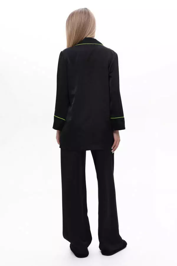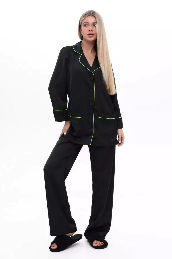 Жіночий домашній костюм, що поєднує вишуканий стиль і комфорт. Виготовлений із щільної атласної тканини, яка прекрасно утримує форму, створюючи елегантний силует. Чорний колір надає образу глибини, а салатовий кант додає вишуканого акценту. Прямі штани і сорочка вільного крою зі стильним коміром та застібкою на ґудзики роблять цей костюм ідеальним вибором для домашнього відпочинку, зустрічі гостей або розслабленого, але стильного проведення часу