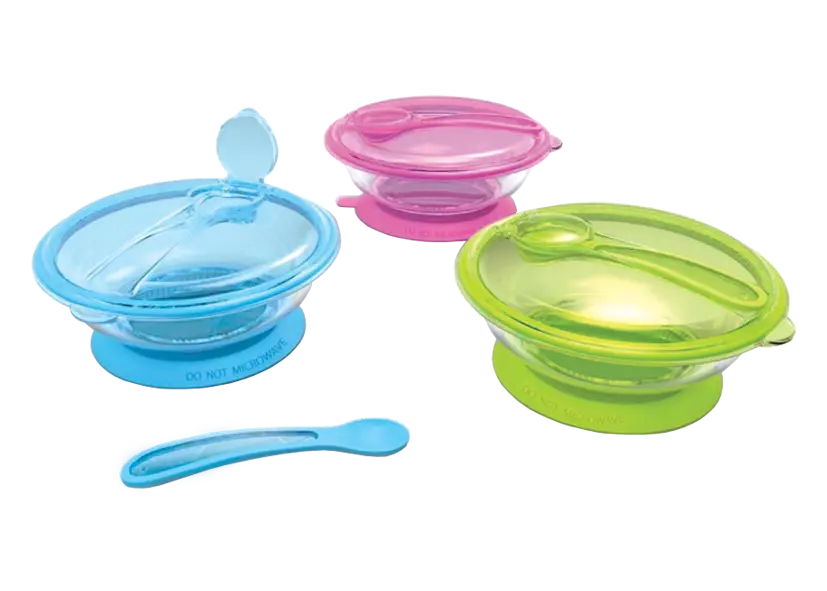 Тарілка легка, термостійкий, ударостійка, за допомогою присоски кріпиться до поверхні столу. Ложка округлої форми може кріпитися в поглиблення на кришці. Можна використовувати в мікрохвильовій печі. Перед використанням промити теплою водою з додаванням нейтрального миючого засобу