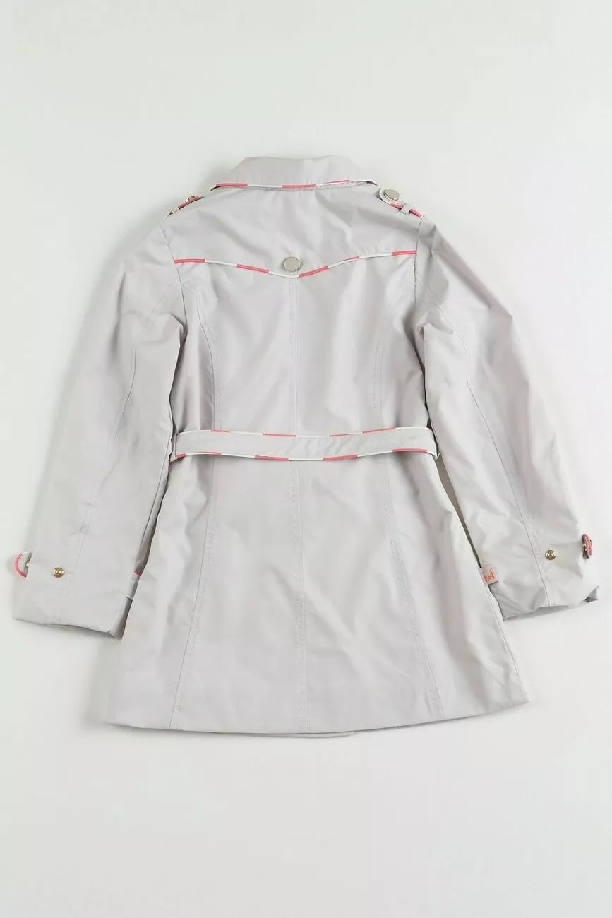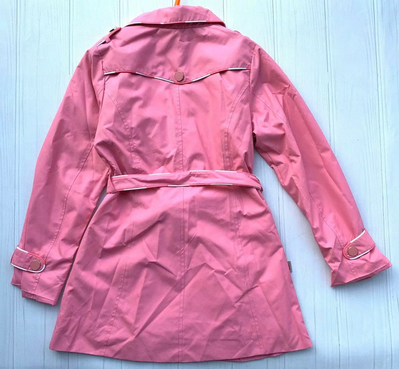 Плащ застегивается на кнопки, на подкладке. Добавлен пояс в тон.