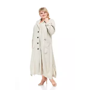 Тканина: льон – 55% льон; 45% змішаний льон. Модний та стильний плащ із тканини льон. Застібається на великі, гарні гудзики; рукав довгий, комір сорочкового вигляду. Виріб має дві великі функціональні кишені. Тканина натуральна, гігроскопічна, добре пропускає повітря. Абсолютна екологічність, зносостійкість та міцність, мінімальна електризуваність, не тягнеться. Виріб прати не вище 40 градусів. Праска з парою полегшить процес прасування, температура не повинна перевищувати 200 градусів.