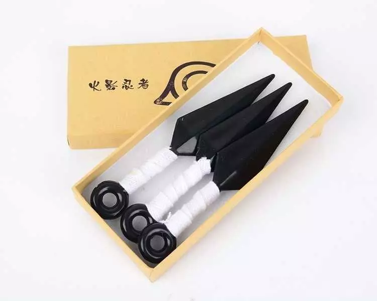 Купити білі кунаї Наруто можна в наборі із трьох кинджалів, упакованих у подарункову коробку з намальованим логотипом японського аніме. Виготовлені вони за аналогічною формою справжніх кинджалів. Лезо із пластику має закруглену форму, що не дозволить завдати пошкодження. Ручка, як і в оригіналі, має обмотку із тканини білого кольору. На нашому сайті можна замовити білий кунай Наруто Узумакі, ціна якого вказана для оптових та роздрібних продажів.