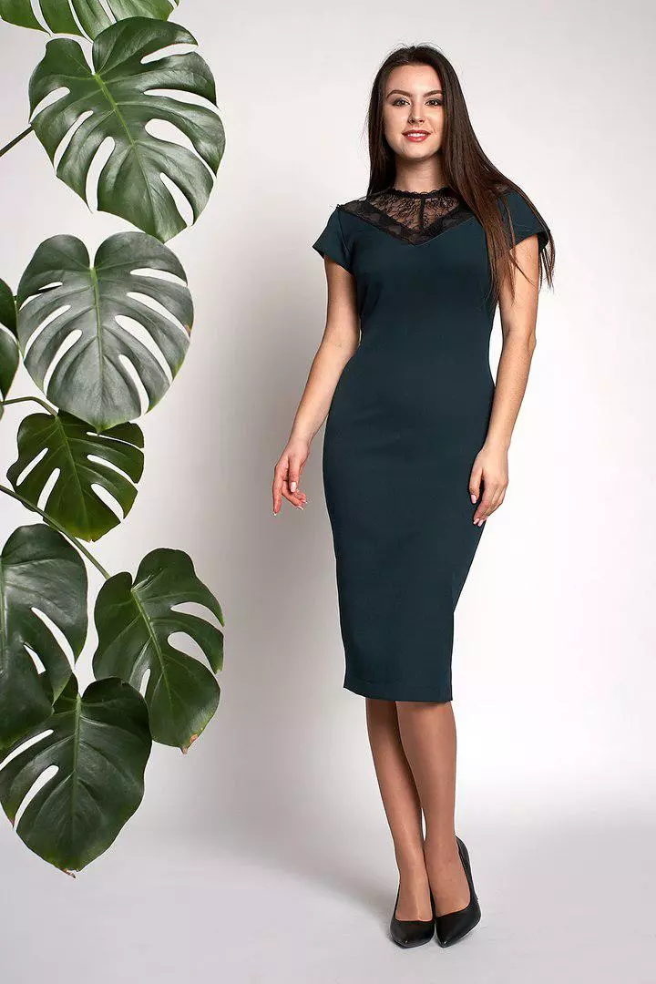 Женственное платье Аделина выполнено из ткани креп-костюмка высокого качества. Платье длиной миди, с коротким рукавом, вставкой из гипюра, приталенного силуэта.