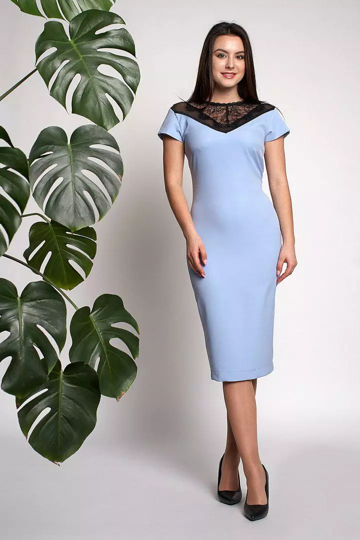 Женственное платье Аделина выполнено из ткани креп-костюмка высокого качества. Платье длиной миди, с коротким рукавом, вставкой из гипюра, приталенного силуэта.