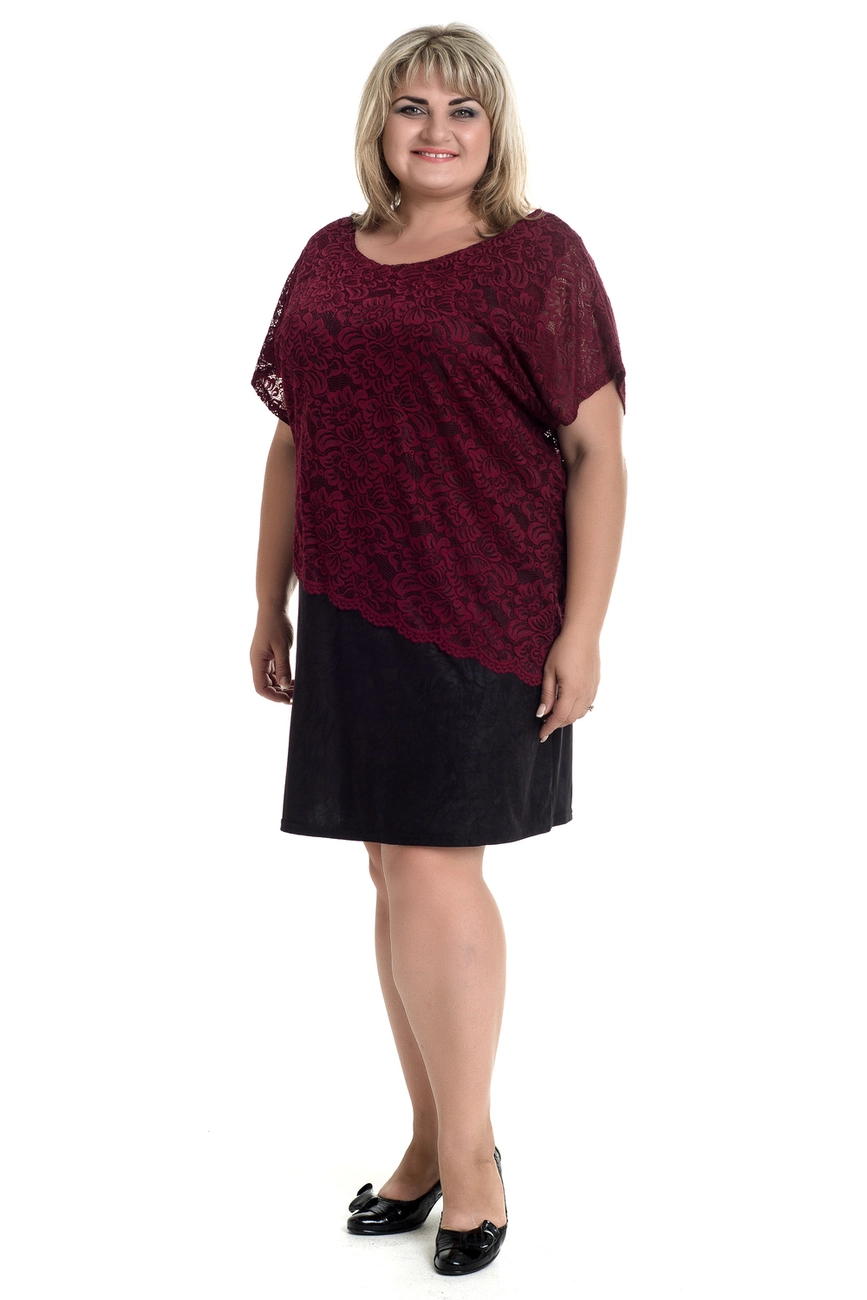 Тканина: олія -70% поліестер, 20% віскоза, 10% еластан; гіпюр-57% поліестер, 40% нейлон, 3% еластан. Модна сукня у діловому стилі напівприлеглого силуету з гіпюровою накидкою. Сукня у вигляді сарафану, накидка з коротким спущеним рукавом. Горловина кругла.