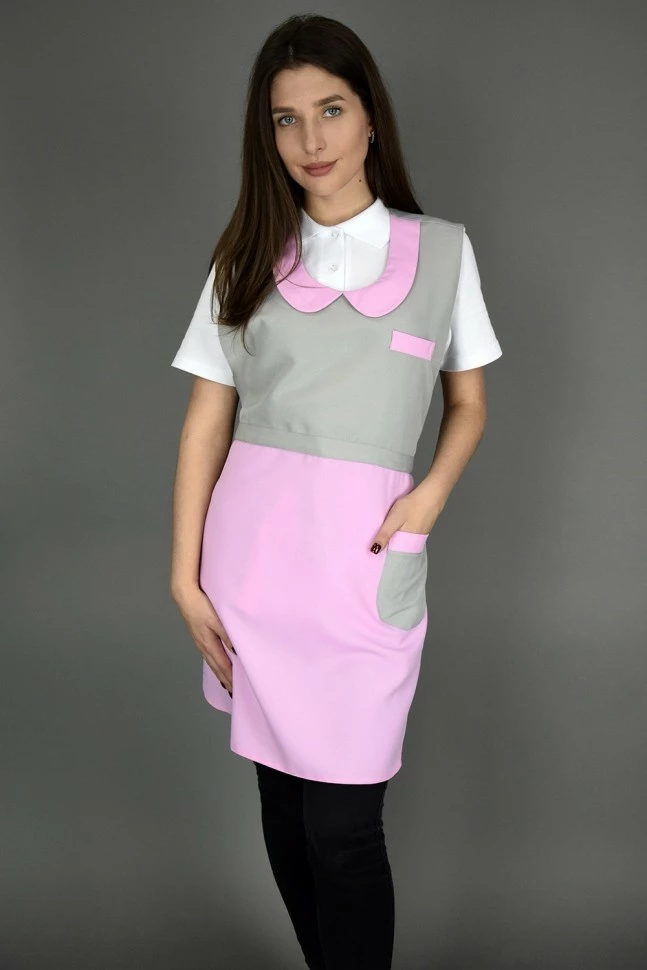Фартук двусторонний, одевается через голову, завязывается по бокам на четыре пояса. Платье – фартук купить можно с декоративным воротником на круглом вырезе в верхней части. На правой груди имитация кармана, на который удобно прикреплять бейдж или табличку с именем сотрудника. В нижней передней части изделия один круглый карман с обтачкой.
