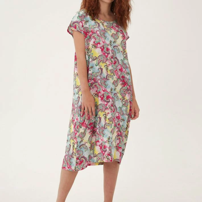 Сукня-футболка прямого крою, виконана з бавовняного штапеля. При