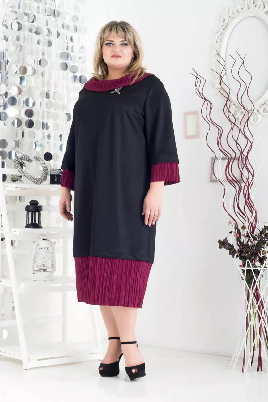 Тканина: кріп костюм-100% поліестер. Ошатне, модне плаття виготовлене з тканини креп трикотаж. Рукав 3/4, горловина хомутом. Горловина, низ рукава та низ вироби з тканини гофре. Виріб прикрашений красивою брошкою. Тканина приємна на дотик, не вимагає особливого догляду.