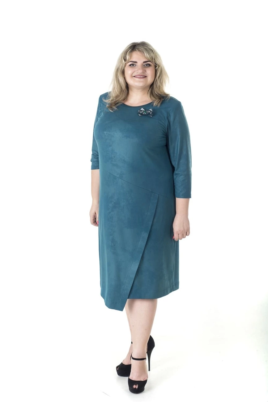 Тканина: неопрен замш - 90% поліестер, 10% еластан. Стильна, легка сукня напівприлеглого силуету. Рукав 3/4, горловина кругла. Низ виробу виконаний запахом. У комплекті тканинна брошка. Легкий, щільний матеріал. Добре тримає форму. Відмінно зберігає свої якості.