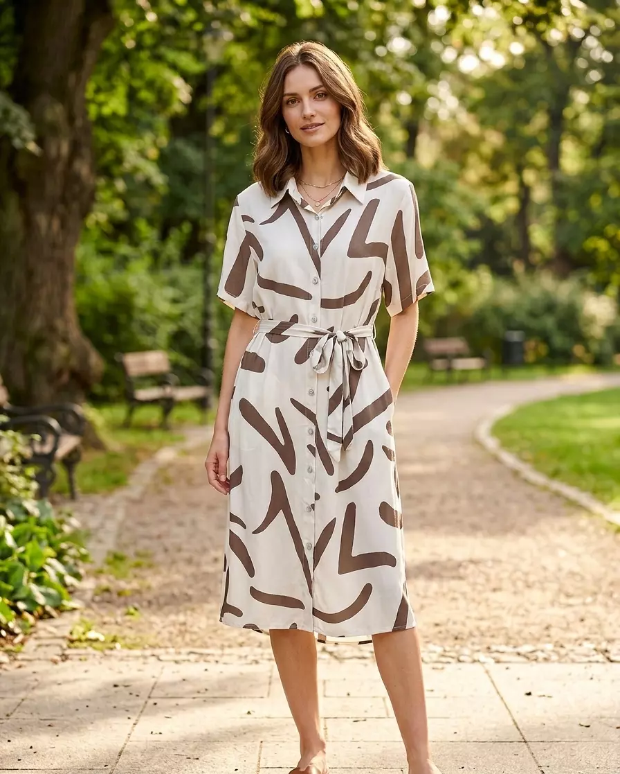 Теплий відтінок моко створює благородний і жіночний образ. Пояс на талії підкреслює силует, а легка тканина штапель робить модель комфортною для літніх прогулянок і щоденного носіння.