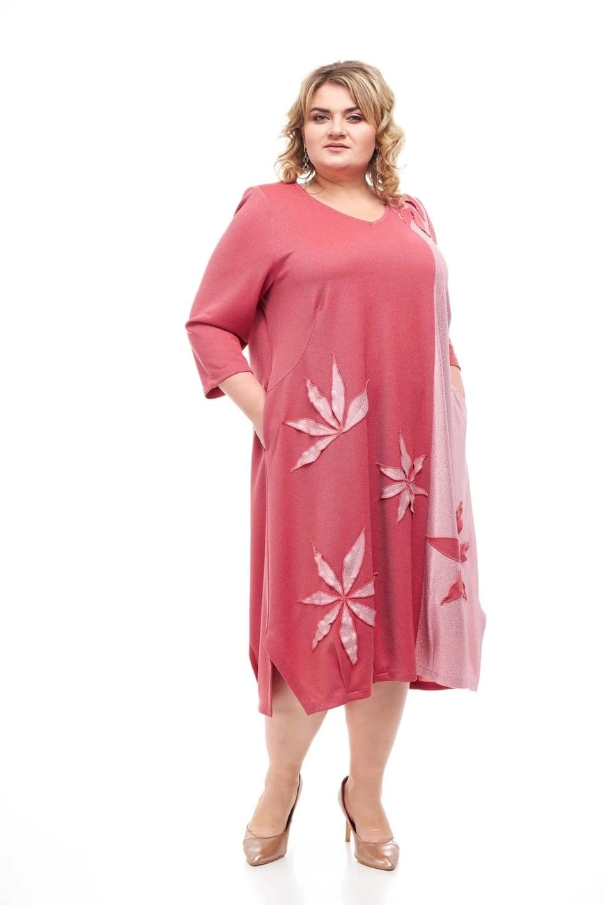 Тканина: креп дайвінг-65% віскоза, 30% поліестер, 5% еластан. Стильна сукня вільного силуету. Рукав 3/4, горловина V-подібна. Прикрашений виріб аплікацією з тканини. Розміри: 62-64 ог-128 от-132 об-150 дв-114 шр-46 др-51; 66-68 ог-136 от-142 об-160 дв-114 шр-48 др-51; 70-72 ог-146 от-152 об-170 дв-114 шр-52 др-51