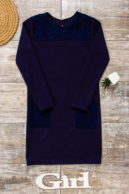 Лаконічна модель стриманого кольору стане стильним акцентом повсякденного шкільного або святкового образу. Модель пошита з французького трикотажу. Французький трикотаж відрізняється від звичайного особливим плетінням ниток, яке робить такий матеріал стійким до деформацій, розтягування. Також полотно володіє більш високою щільністю, але при цьому він досить м'який на дотик. Виріб прикрашено кишенями з стрейч-гіпюру. Завдяки стильному крою дівчинка відчує впевненість  в собі та зможе сміливо експерементувати з аксессуарами.