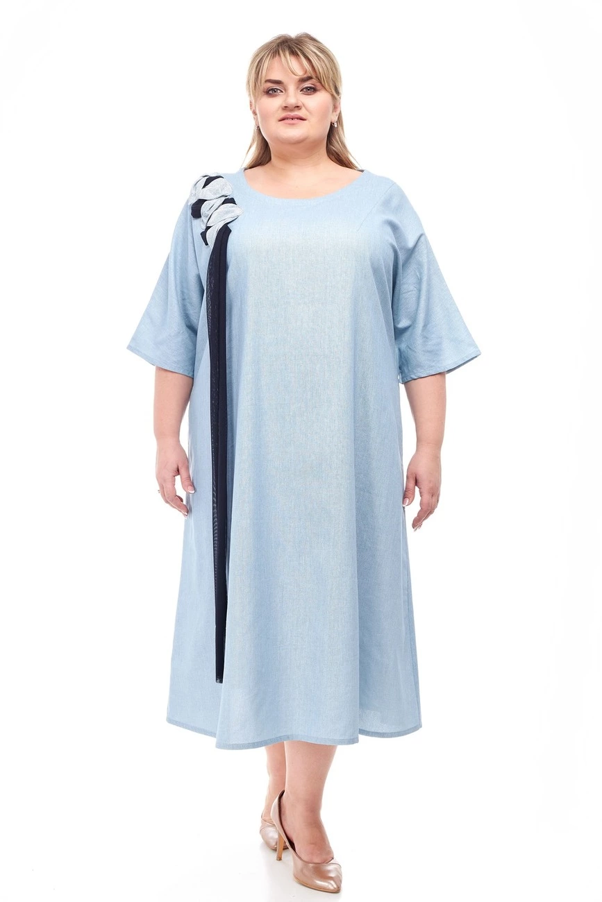 Тканина: льон -75% льон; 25% віскоза. Красива, модна сукня вільного силуету з тканини льон. Рукав широкий, спущений. Горловина кругла. Виріб прикрашений довгою косою з тканини. Тканина гарної якості, гігроскопічна.