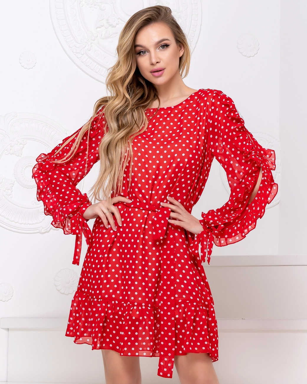 Платье шифоновое красное белый горох