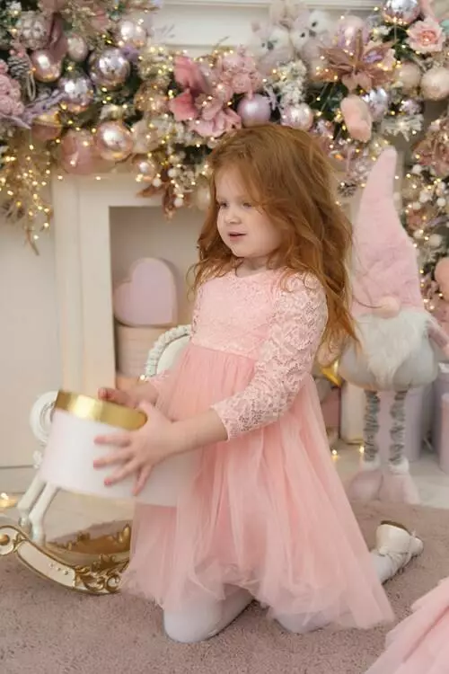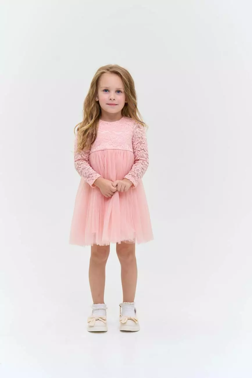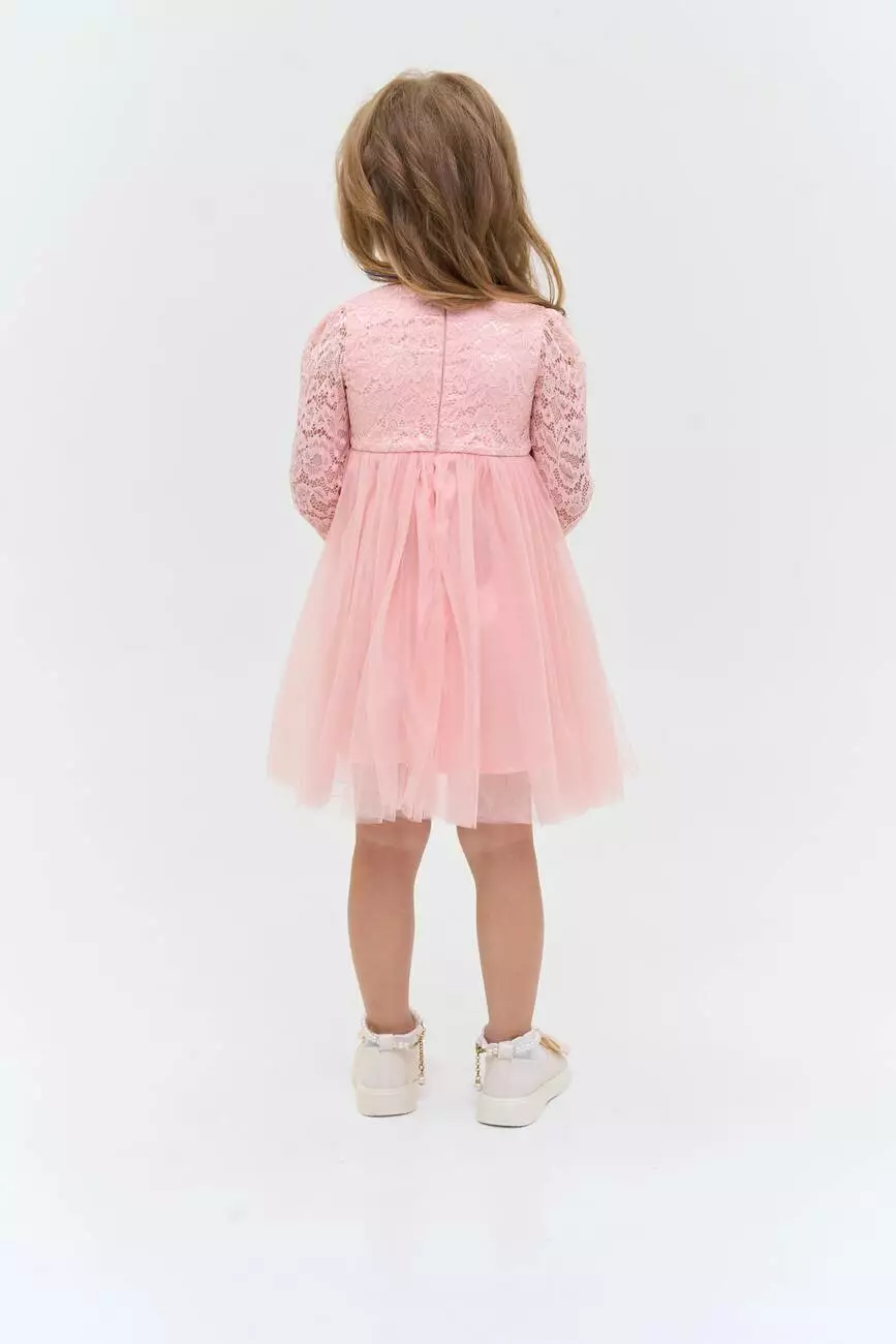 Деталі моделі: Сукня пудрового кольору. Верх сукні виконаний із якісного гіпюру, Підкладка бавовняна. Кругла горловина. Довгий рукав. Застібка – блискавка на спинці. Спідниця пишна виконана із двох шарів фатину. Третій, нижній шар спідниці - із атласу. Сукня добре тримає форму. Довжина виробу – по коліно. Розмірний ряд: на зріст від 80 см до 104 см