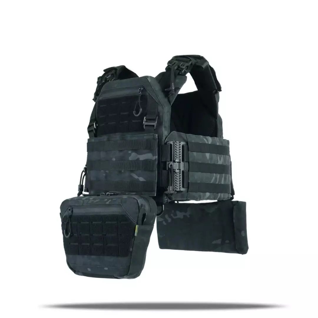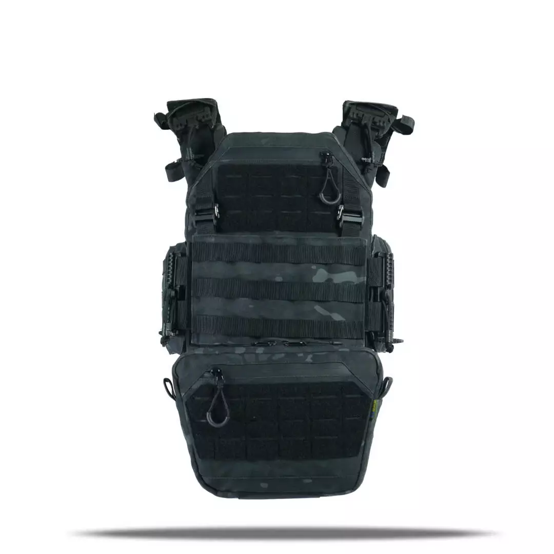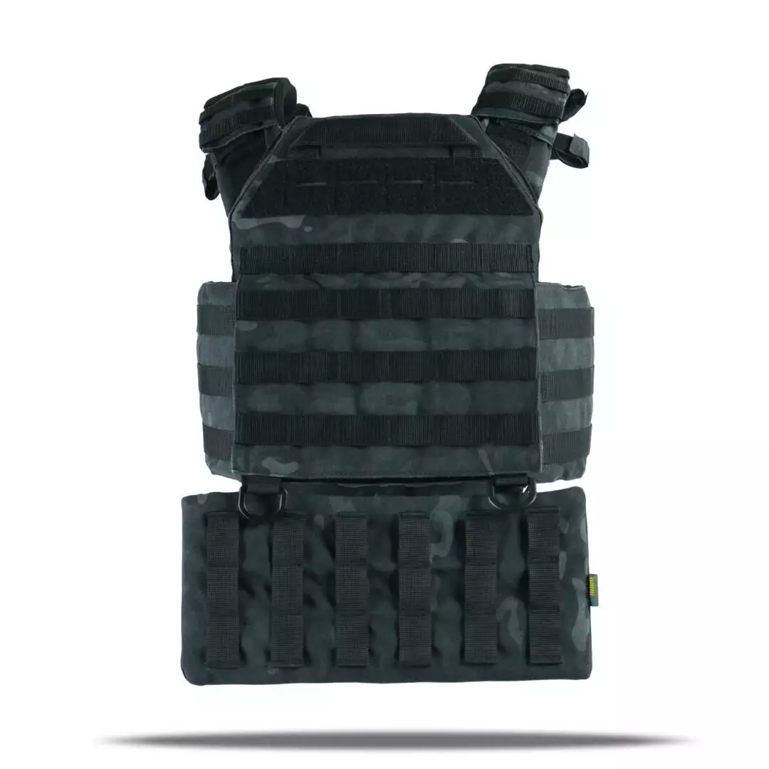 Плитоноска оснащена съемной передней Molle панелью, которая крепится к основанию на Velcro и дополнительно двумя карабинами Woojin. На ней удобно размещаются 3 итога под 1 или два магазина, или другое Molle-совместимое снаряжение. Эту панель можно быстро заменить другой с закрёклым на нее заранее набором нужных итогов.