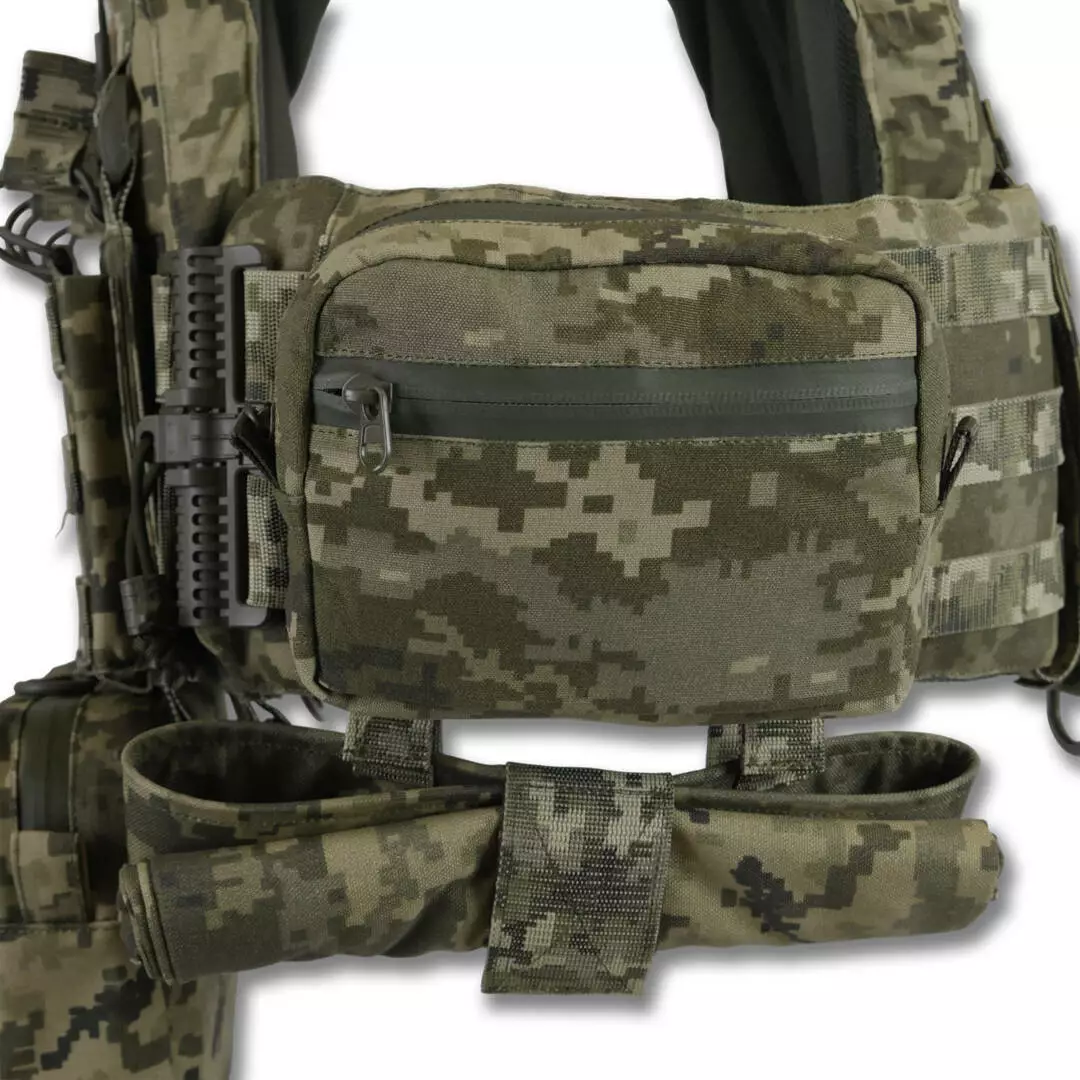 Плитоноска оснащена съемной передней Molle панелью, которая крепится к основанию на Velcro и дополнительно двумя карабинами Woojin. На ней удобно размещаются 3 итога под 1 или два магазина, или другое Molle-совместимое снаряжение. Эту панель можно быстро заменить другой с закрёклым на нее заранее набором нужных итогов.