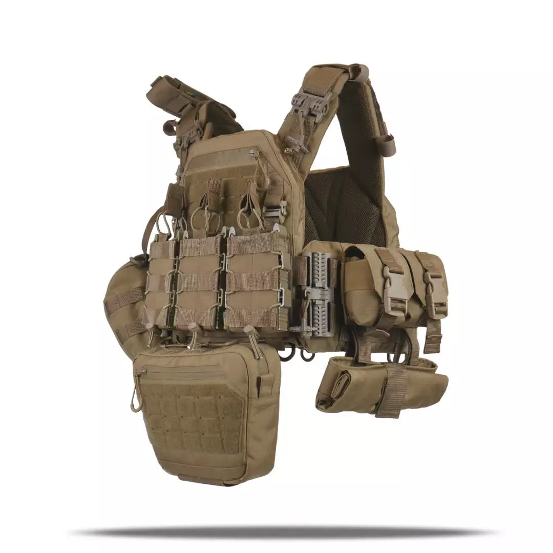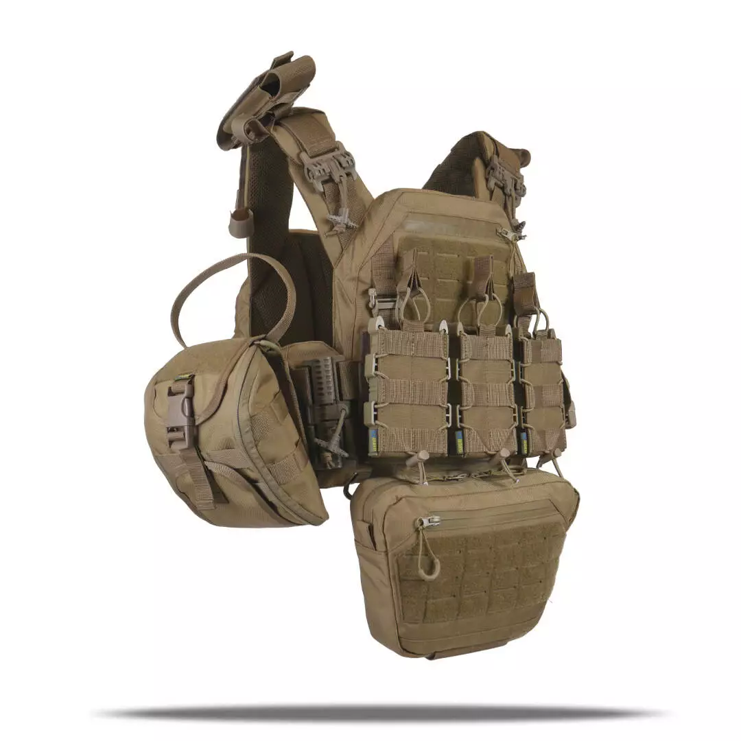 Плитоноска оснащена съемной передней Molle панелью, которая крепится к основанию на Velcro и дополнительно двумя карабинами Woojin. На ней удобно размещаются 3 итога под 1 или два магазина, или другое Molle-совместимое снаряжение. Эту панель можно быстро заменить другой с закрёклым на нее заранее набором нужных итогов.