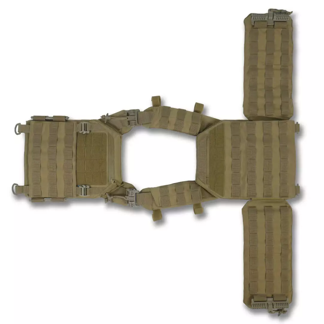 Плитоноска оснащена съемной передней Molle панелью, которая крепится к основанию на Velcro и дополнительно двумя карабинами Woojin. На ней удобно размещаются 3 подсумка под один или два магазина, или другое Molle-совместимое снаряжение. Эту панель можно быстро заменить другой с закрепленным на нее заранее набором нужных подсумков.