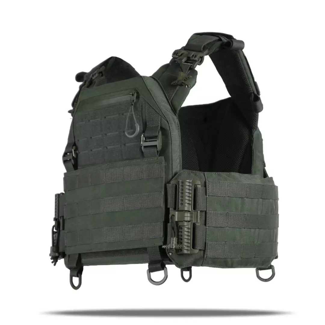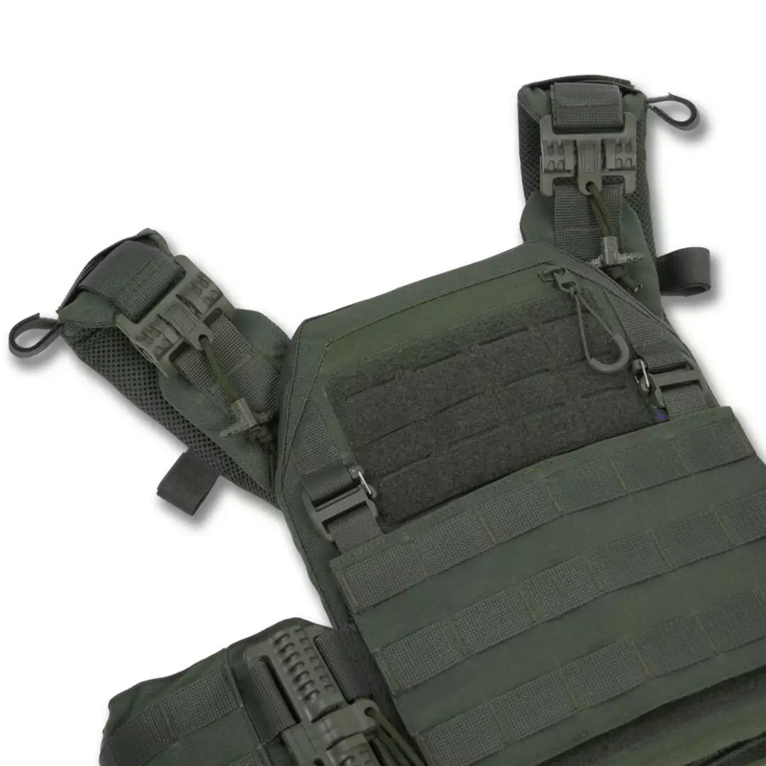 Плитоноска оснащена съемной передней Molle панелью, которая крепится к основанию на Velcro и дополнительно двумя карабинами Woojin. На ней удобно размещаются 3 подсумка под один или два магазина, или другое Molle-совместимое снаряжение. Эту панель можно быстро заменить другой с закрепленным на нее заранее набором нужных подсумков.