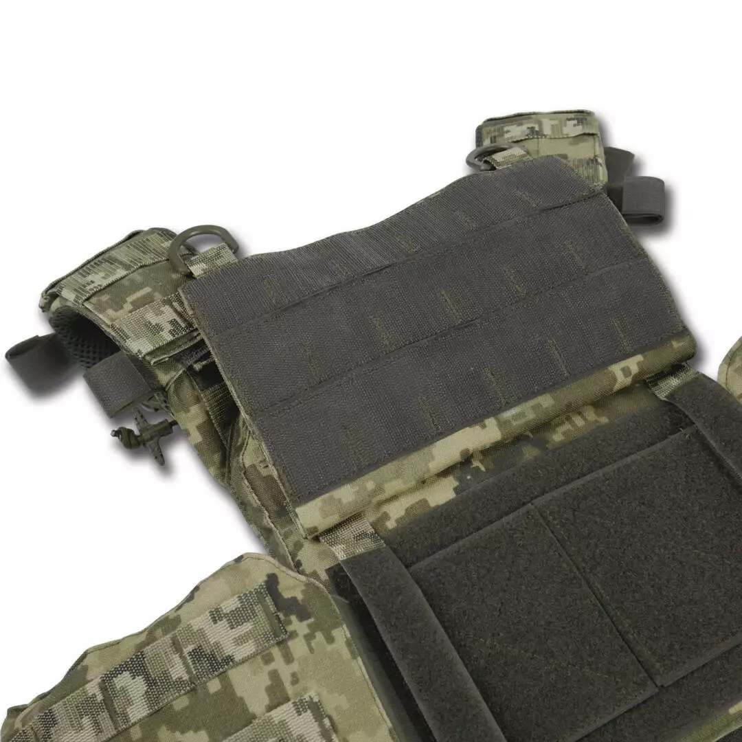 Фронтальная часть плитоноски имеет четыре ряда с-ми Molle и велкро панель с Luser Cut Molle усиленную изнутри стропой для Molle-совместимого снаряжения и ID-патчей и ручку для эвакуации, которая в походном положении фиксируется к спинке панелями Velcro.