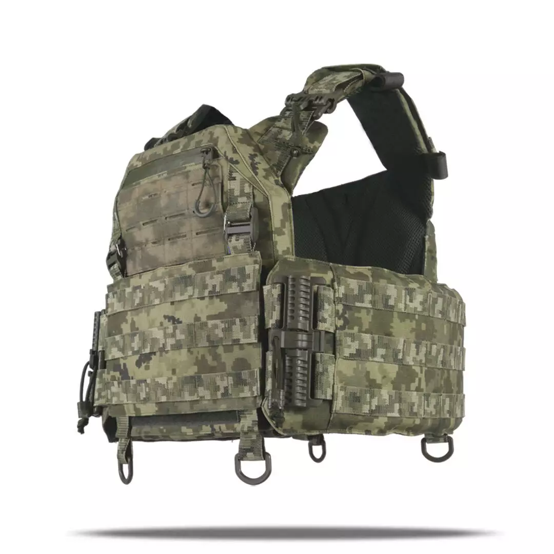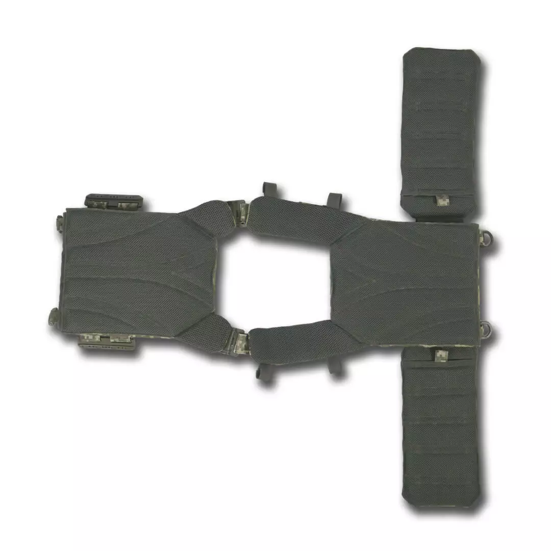 Плитоноска оснащена съемной передней Molle панелью, которая крепится к основанию на Velcro и дополнительно двумя карабинами Woojin. На ней удобно размещаются 3 подсумка под один или два магазина, или другое Molle-совместимое снаряжение. Эту панель можно быстро заменить другой с закрепленным на нее заранее набором нужных подсумков.