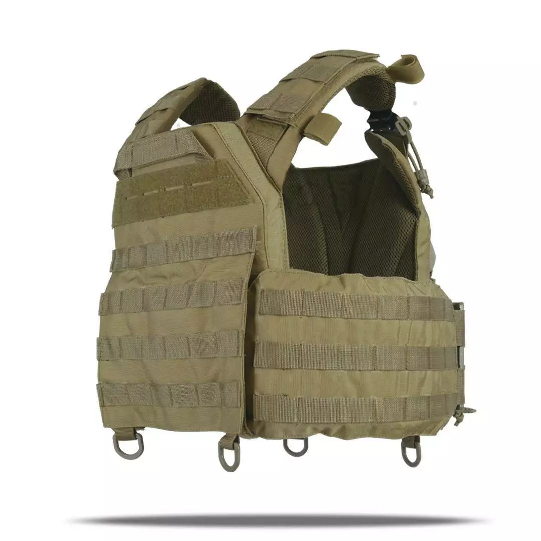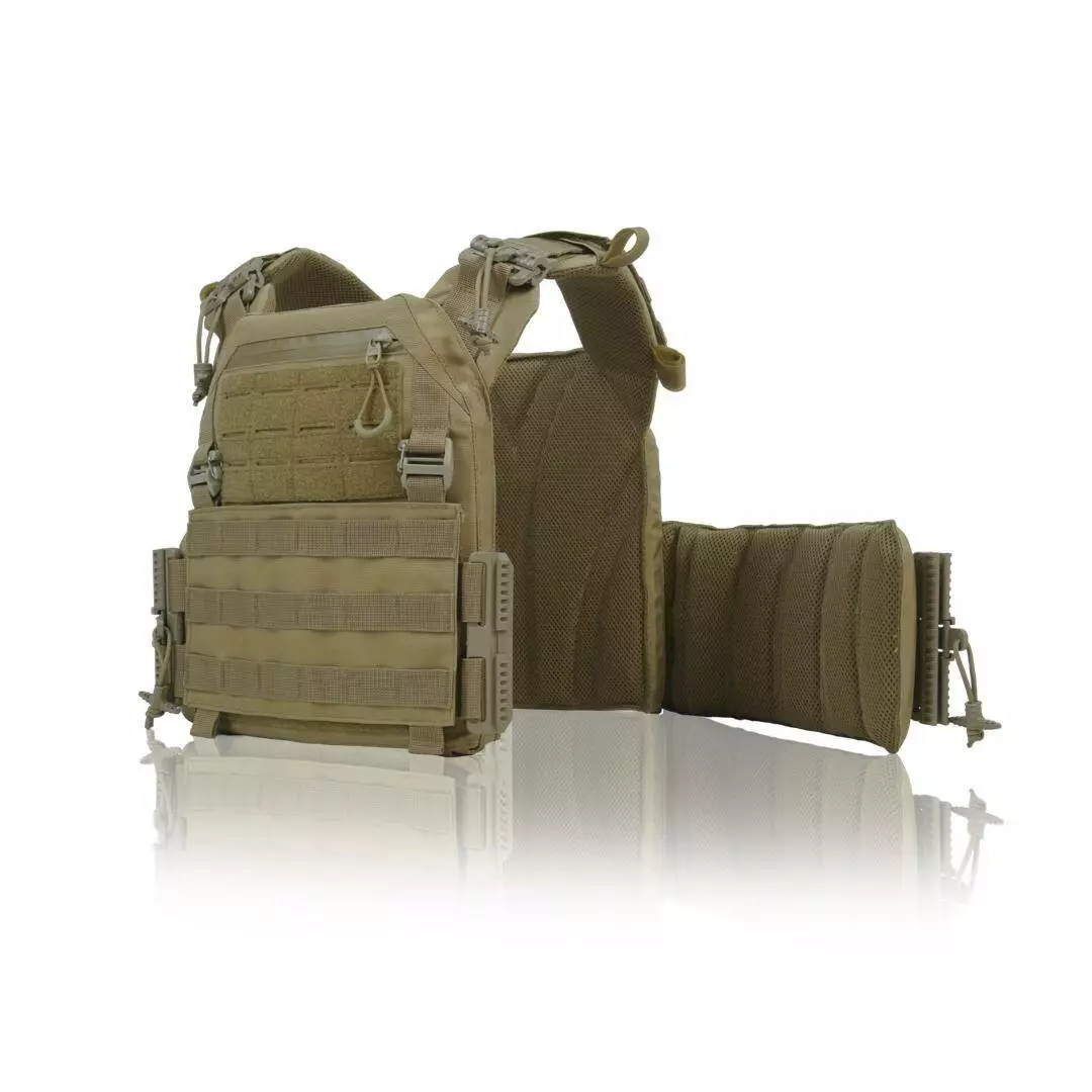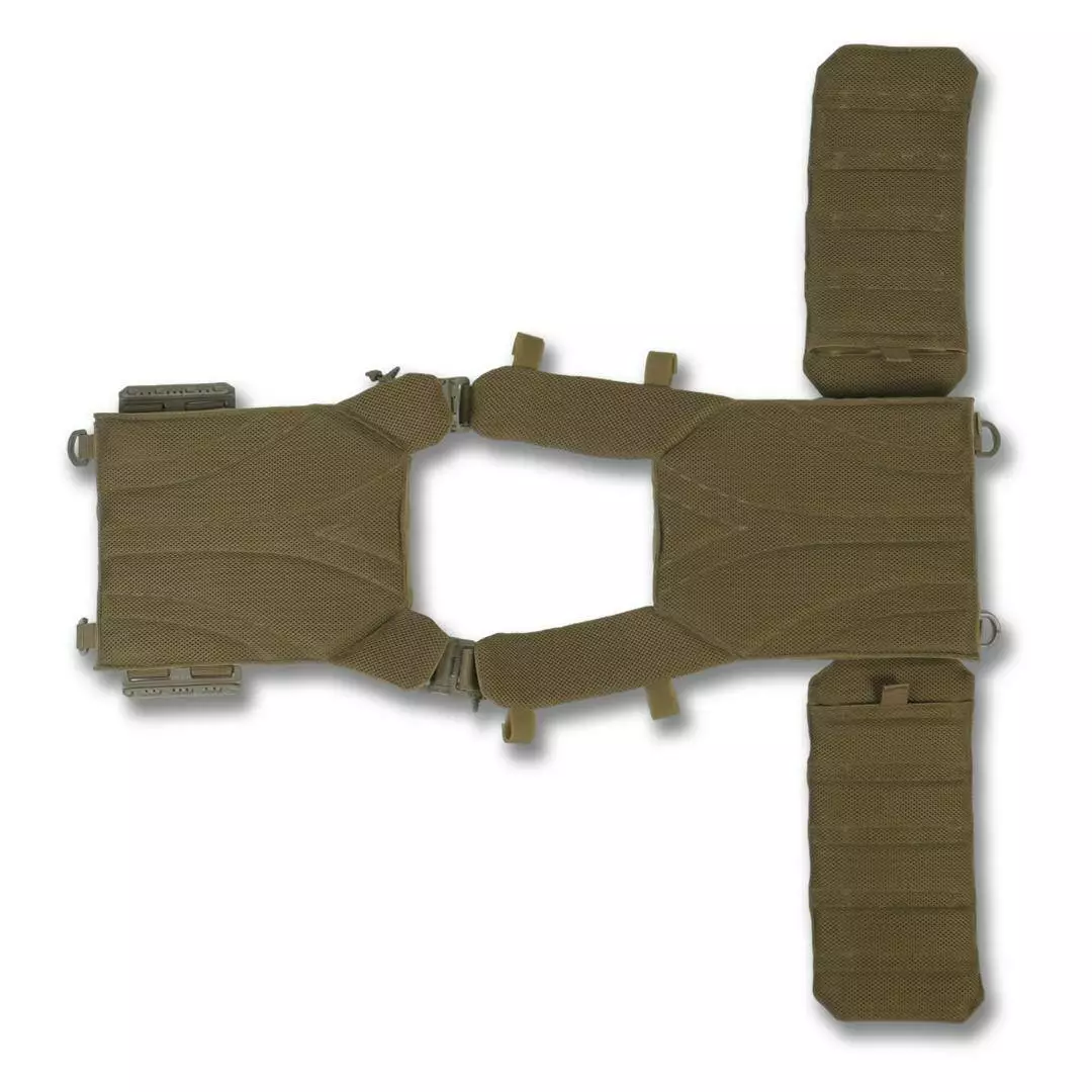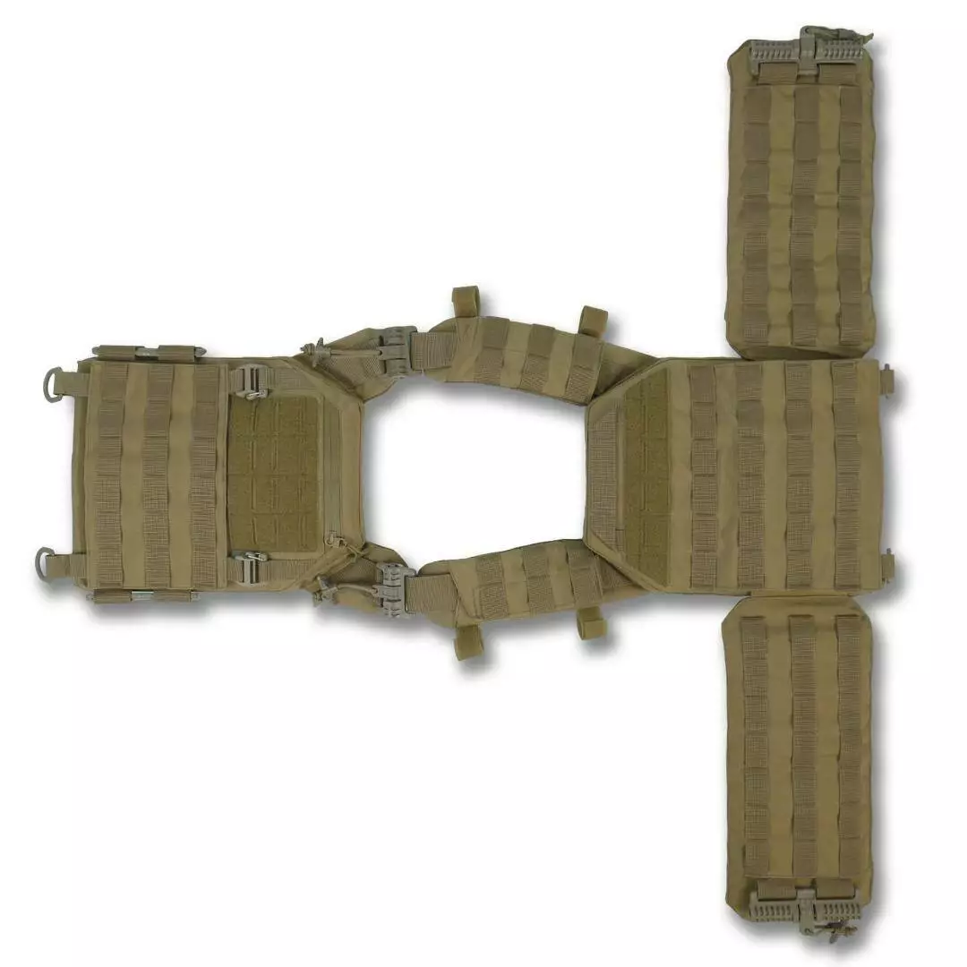 Плитоноска оснащена съемной передней Molle панелью, которая крепится к основанию на Velcro и дополнительно двумя карабинами Woojin. На ней удобно размещаются 3 итога под 1 или два магазина, или другое Molle-совместимое снаряжение. Эту панель можно быстро заменить другой с закрёклым на нее заранее набором нужных итогов.