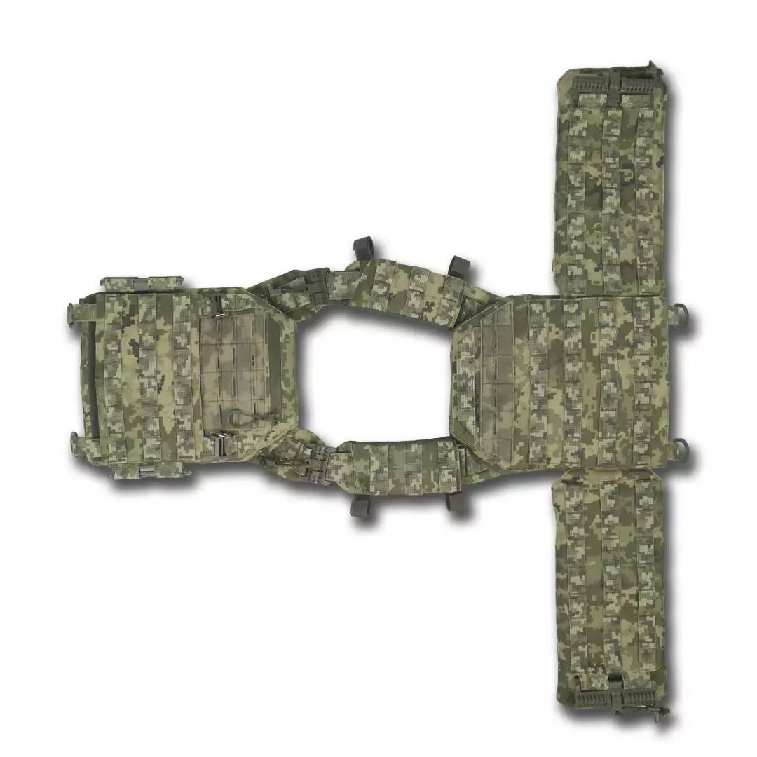 Плитоноска оснащена съемной передней Molle панелью, которая крепится к основанию на Velcro и дополнительно двумя карабинами Woojin. На ней удобно размещаются 3 итога под 1 или два магазина, или другое Molle-совместимое снаряжение. Эту панель можно быстро заменить другой с закрёклым на нее заранее набором нужных итогов.