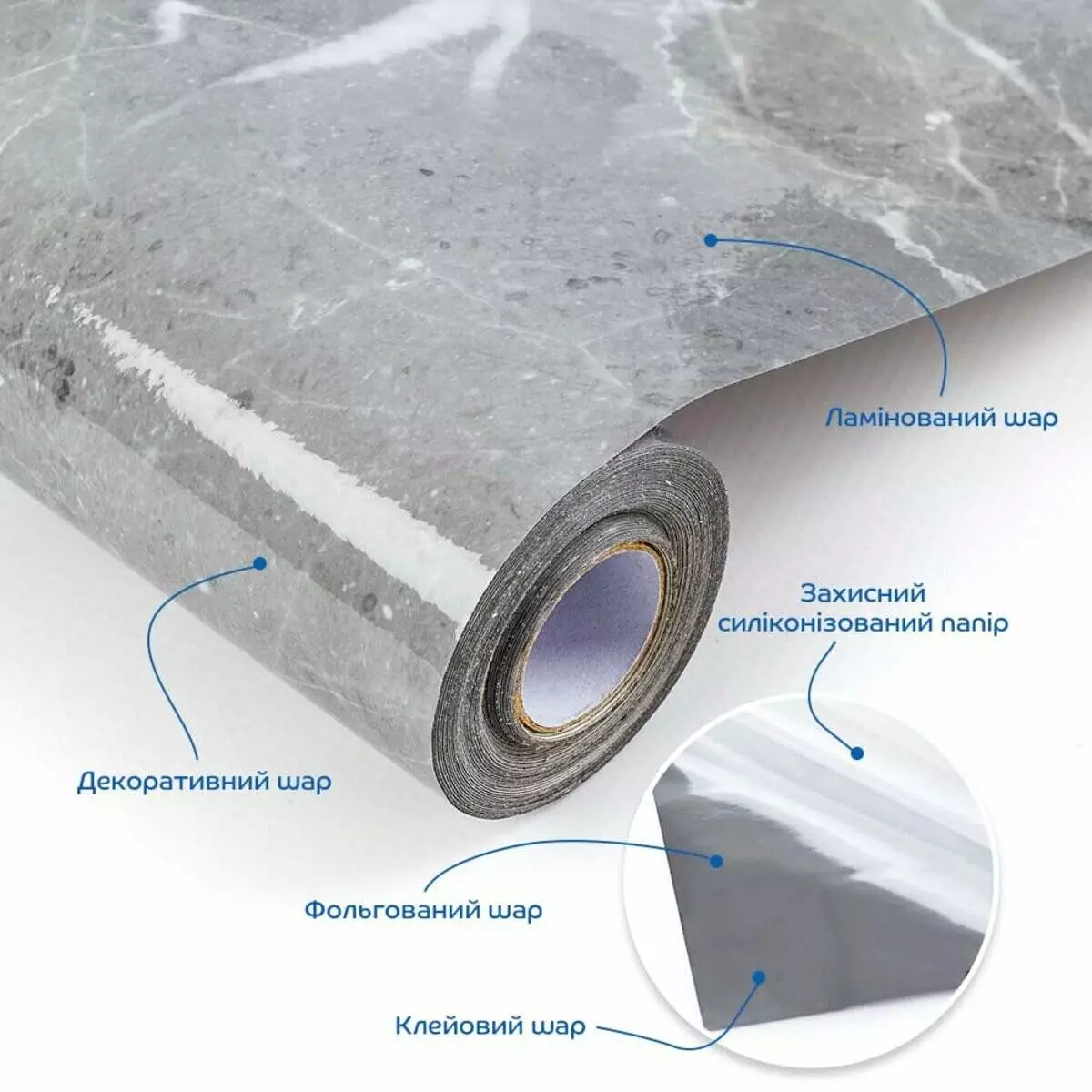 • Захисний силіконізований папір – покриває клейовий шар до монтажу. Вона запобігає випадковому прилипанню плівки, захищає клейовий шар від пересихання та забруднення, легко знімається при монтажі. Маркування на задній поверхні захисного паперу спростить різання матеріалу.