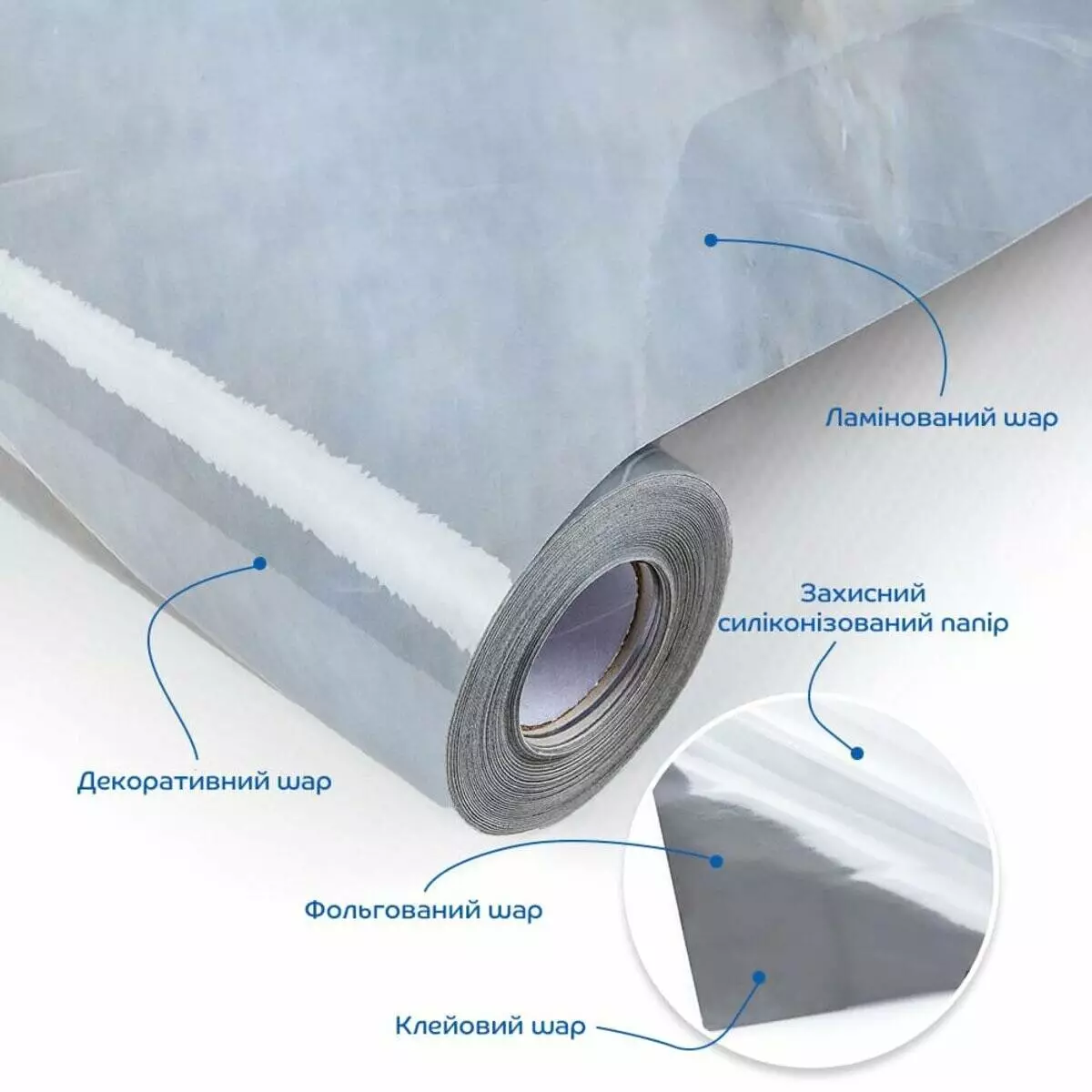 • Захисний силіконізований папір – покриває клейовий шар до монтажу. Вона запобігає випадковому прилипанню плівки, захищає клейовий шар від пересихання та забруднення, легко знімається при монтажі. Маркування на задній поверхні захисного паперу спростить різання матеріалу.