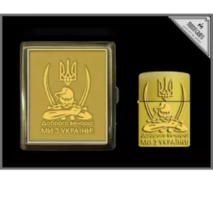 Оригинальный подарочный набор, состоящий из металлического портсигара и газовой зажигалки. Декорирован рельефным изображением казака с саблями, герба Украины и патриотической надписью «Доброго вечора! Ми з України!». Такой комплект станет отличным подарком для военных, патриотов, коллекционеров и всех, кто гордится своей страной.