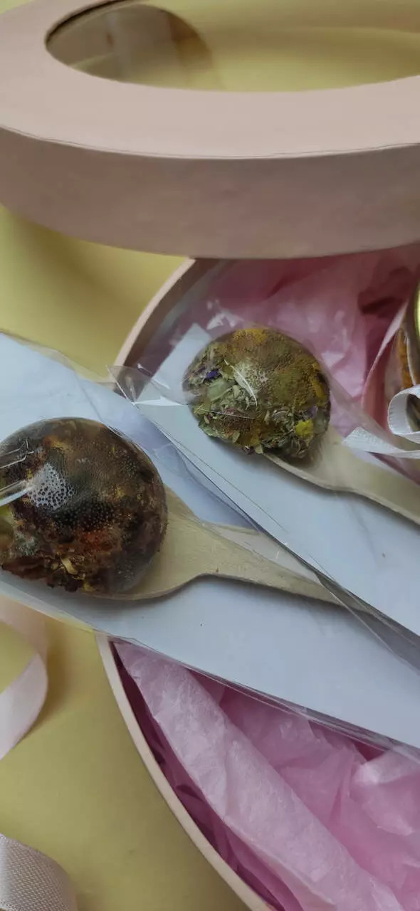 • 2 різновиди ароматного чаю в дерев’яних ложках – трав’яний чай з пелюстками квітів та лісовими ягодами, запакований у прозорі розчинні сфери в дерев'яних ложках.