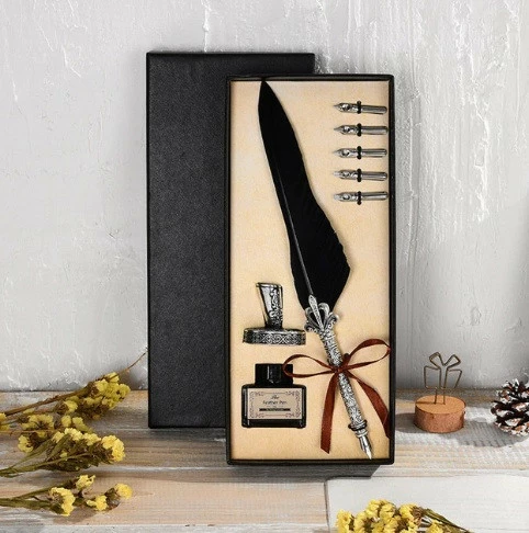 В комплект входить: ручка перова, чорнильниця, підставка під ручку і 5 наконечників.