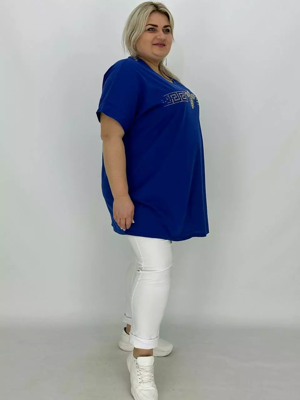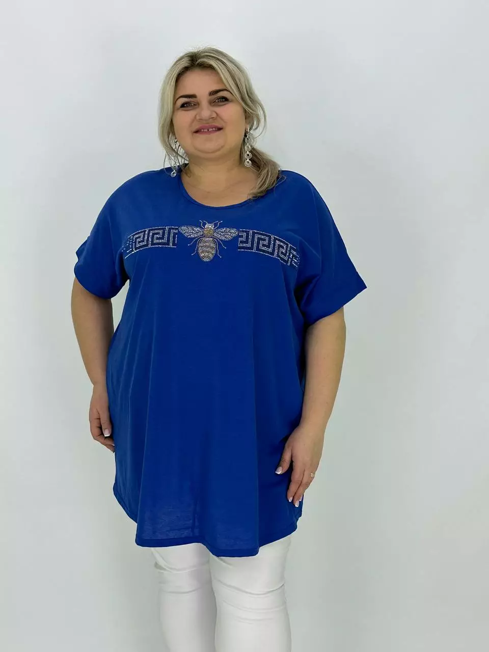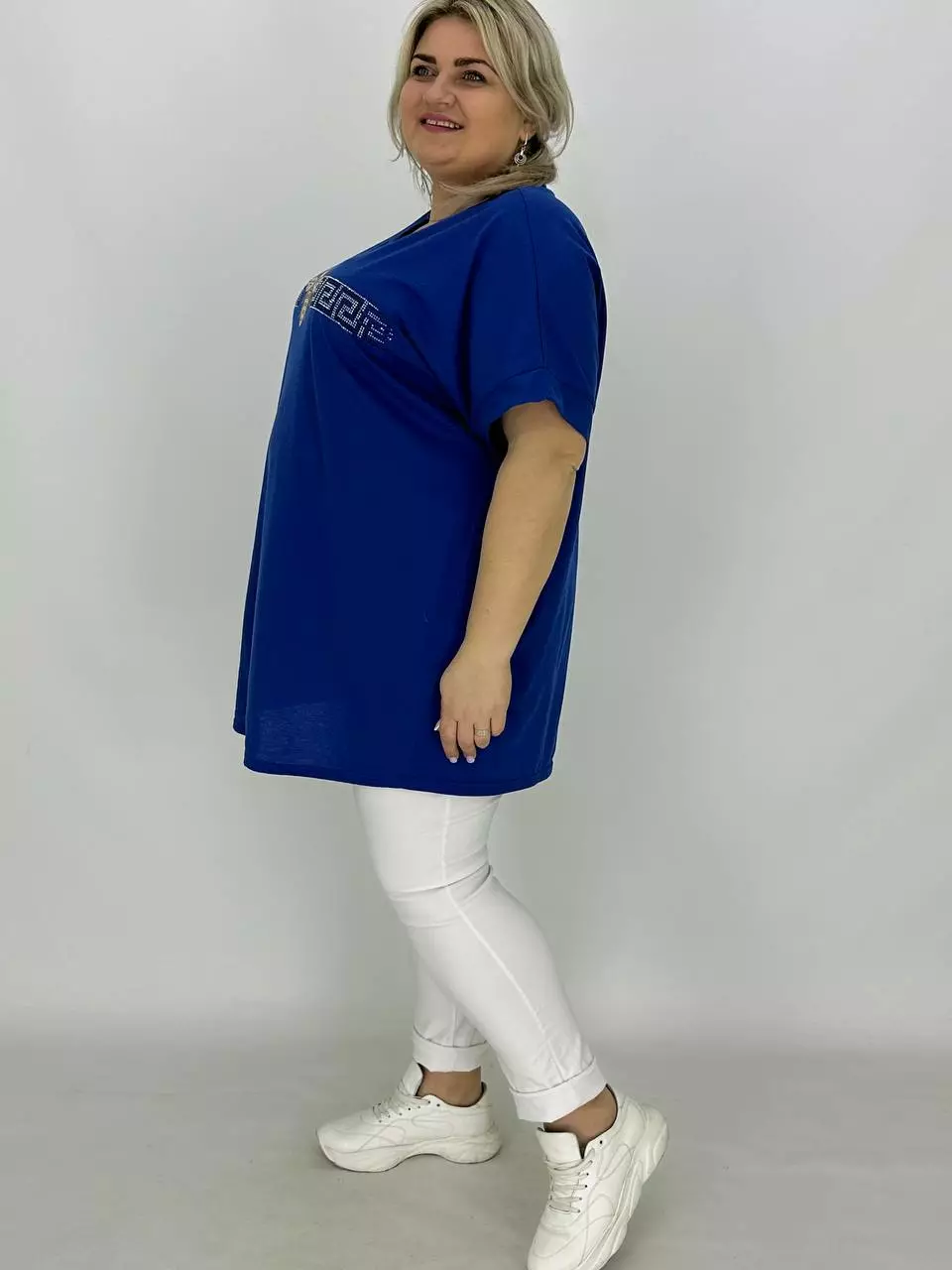 Подовжена футболка з турецького трикотажу супрем з гарною розтяжністю, прикрашена якісною камінною накаткою.
