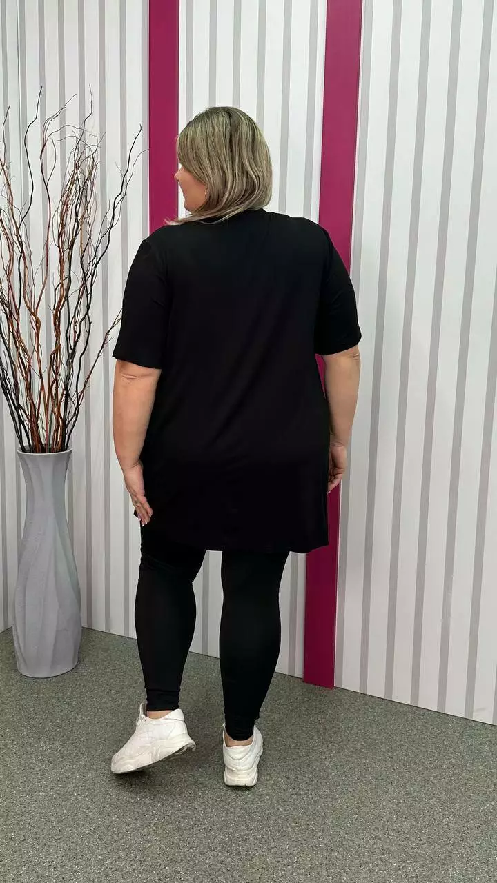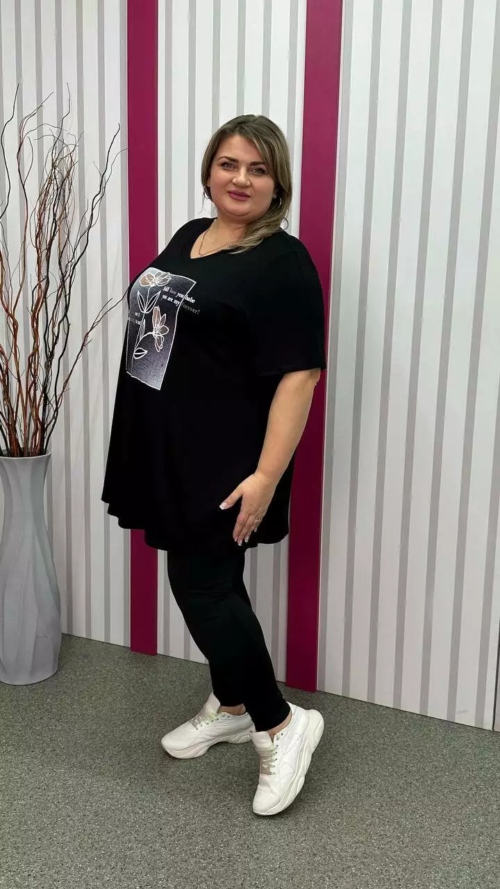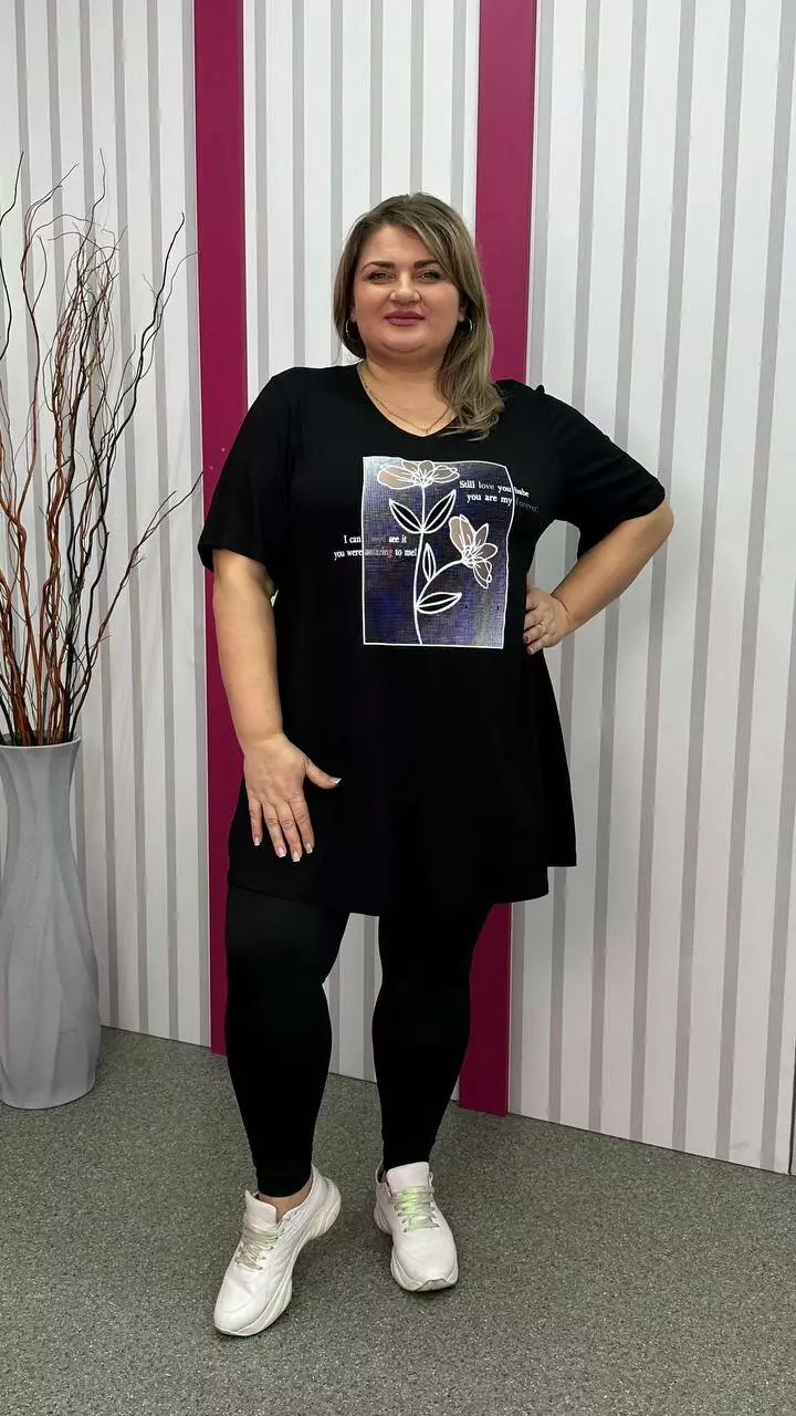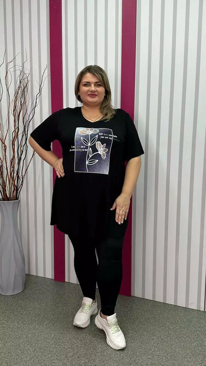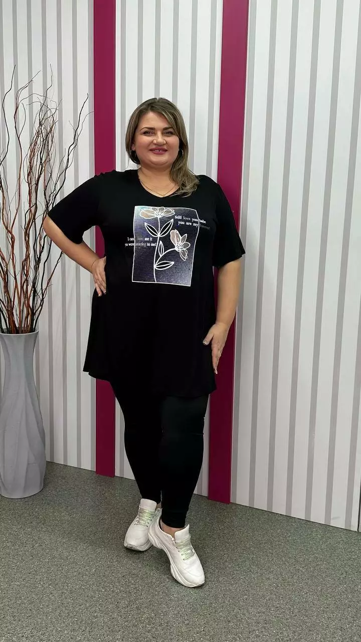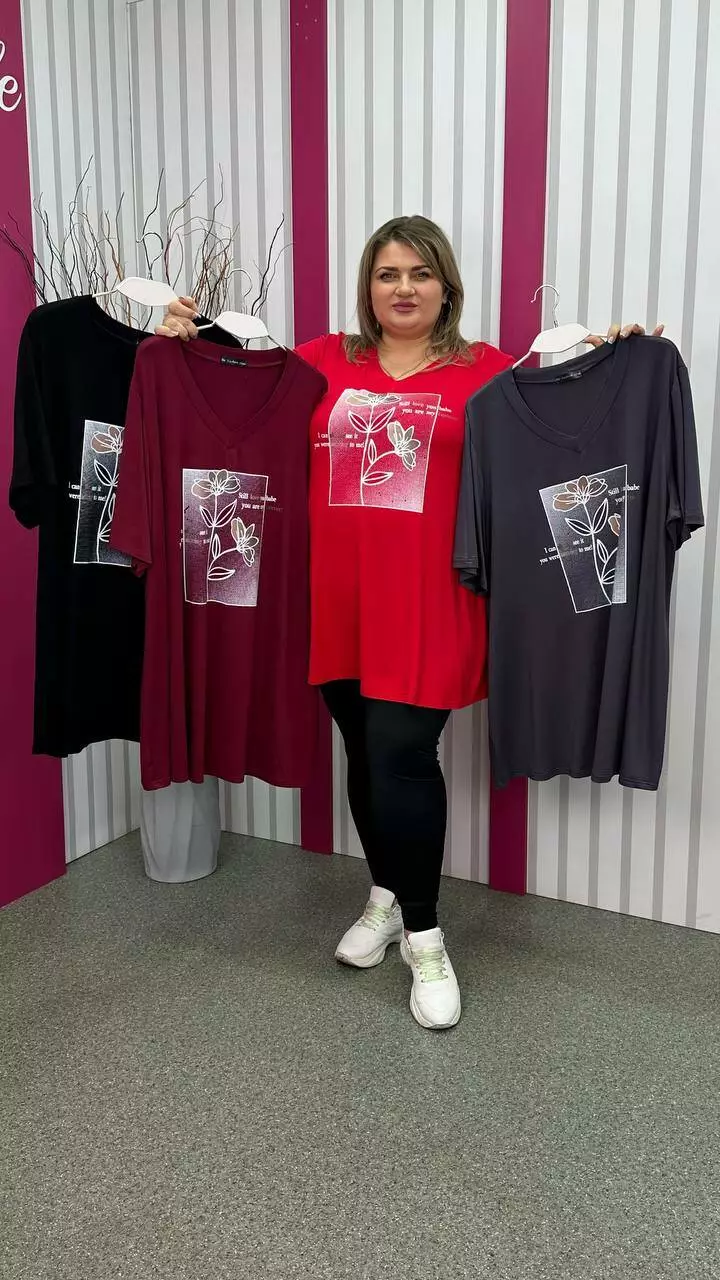 Розкльошена та подовжена футболка з трикотажу віскоза виробництва Туреччина. Легка, м'яка тканина з гарною розтяжністю, не кашлатиться. Силует-трапеція, рукав втачний, горловина мисик, прикрашена якісним накатом.