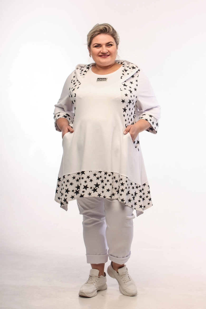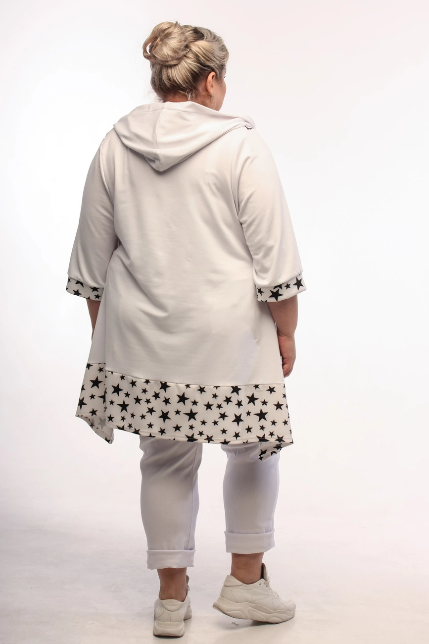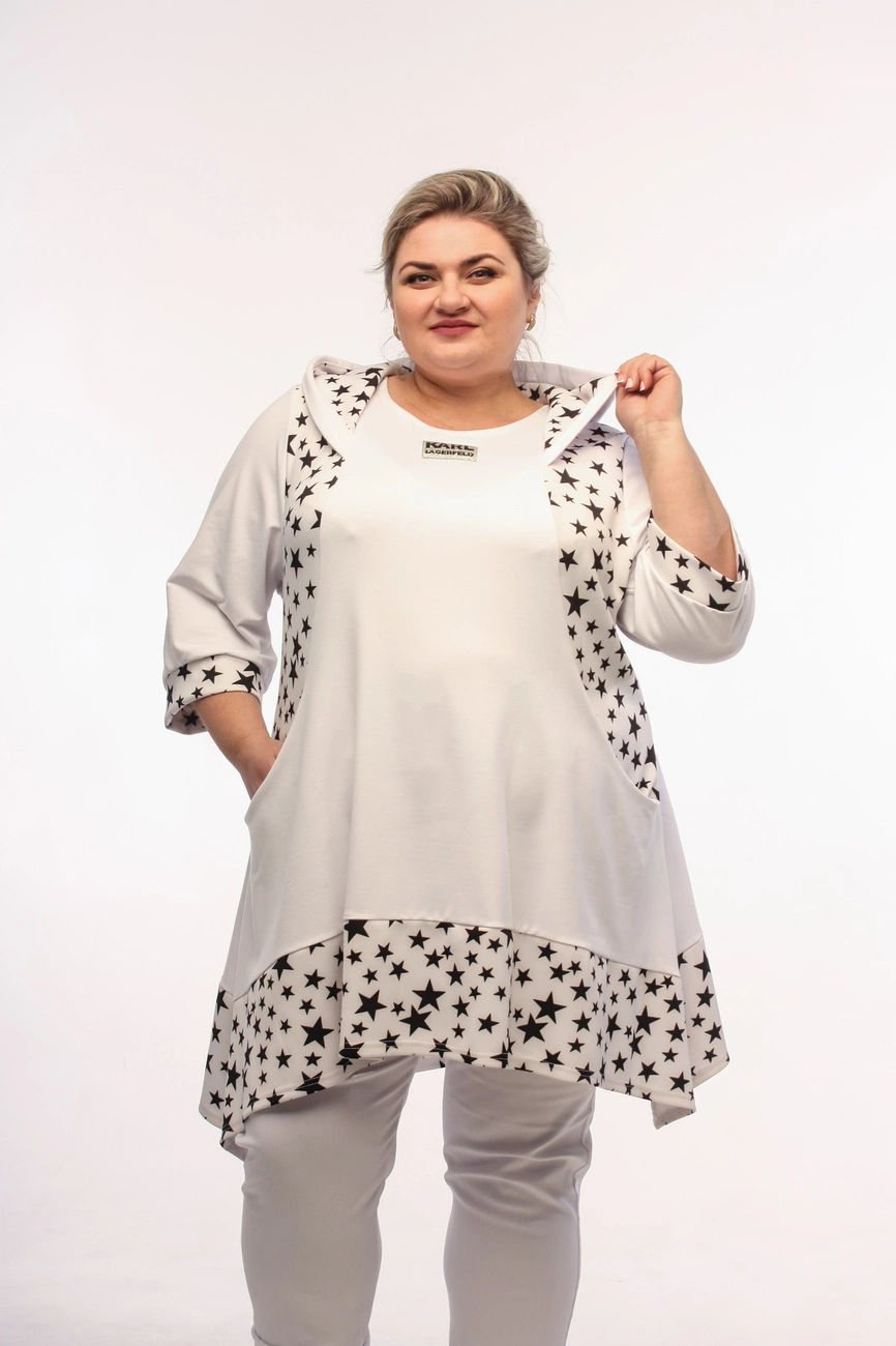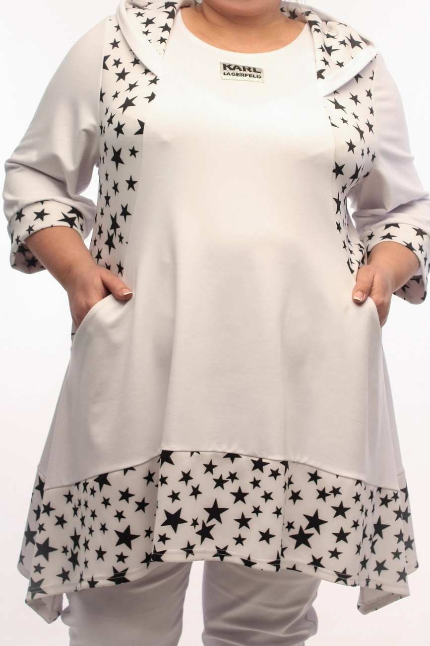 Подовжена туніка з асиметричним низом, клешонна. Кишені у рельєфах, рукав втачний, з капюшоном. Оздоблена нашивками. Тканина двонитка комбінована з дайвінгом. Щільність середня, розтяжність хороша.