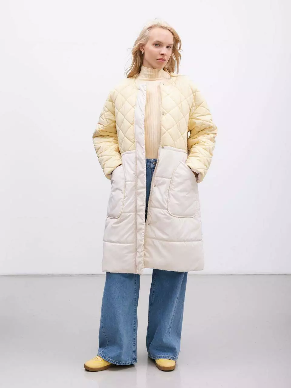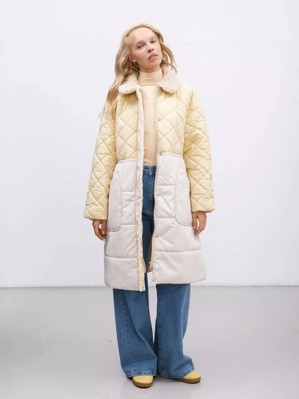 Ця подовжена утеплена куртка-пальто об'єднує в собі елегантність і практичність, створюючи унікальний образ для холодної пори року. Виготовлена з двох видів тканин, вона привертає увагу своїм дизайном: верхня частина жовта стьобана, а нижня частина кремового кольору, що додає особливого шарму.
