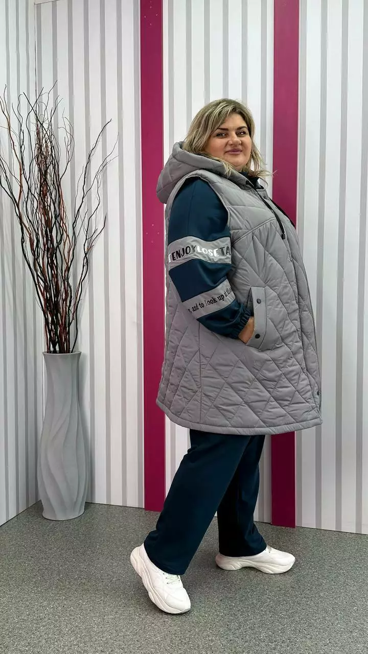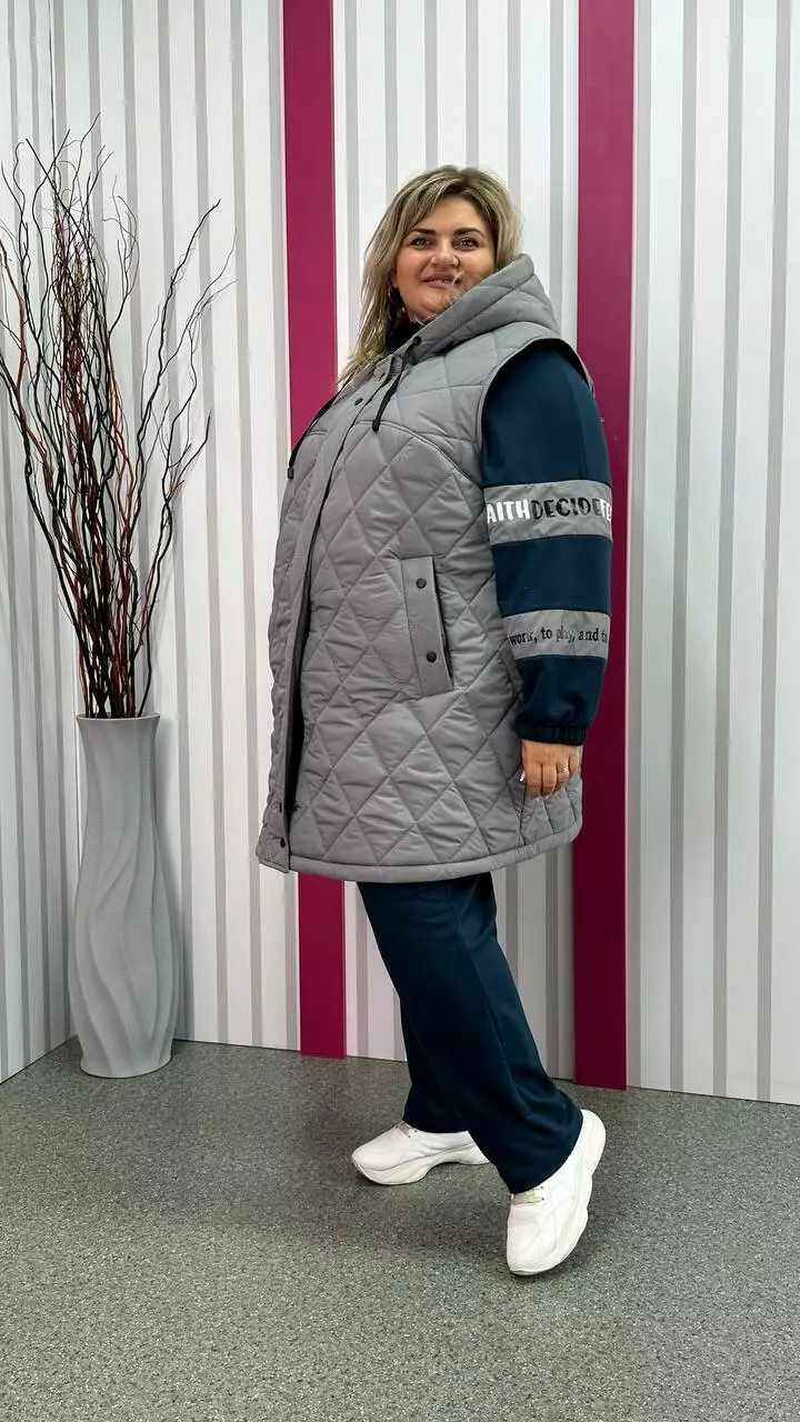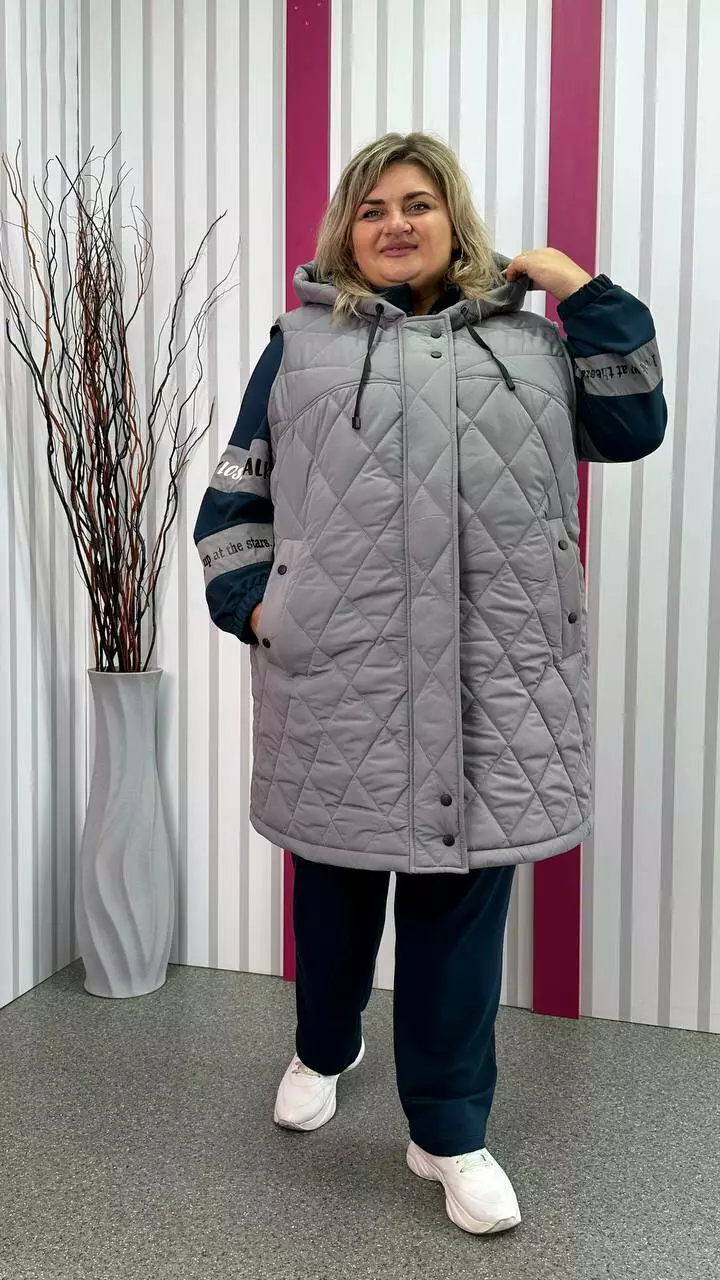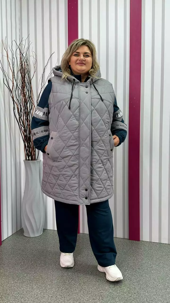 Подовжена тепла жилет зі стьобаної плащівки "Еммі" та "Лаке" наповнення силікон 120. Прикрашений контрастним оздобленням по підборам і середина капюшона. Силует А образний, в кокетку закладена виточка на груди, кишені листочка, планка на кнопках, застібка змійка. М'який, легкий та теплий жилет не пропускає воду та вітер. Посадка ідеальна, зручна пройма, відмінний комплект зі спортивним костюмом.