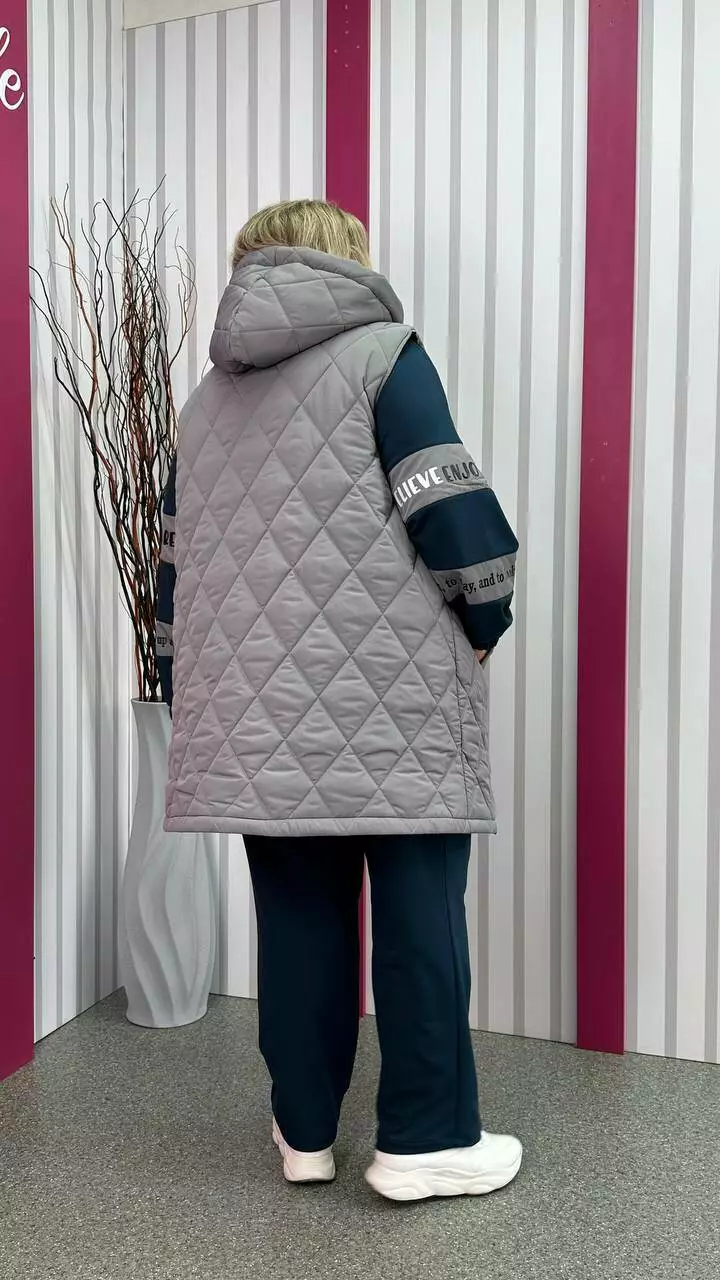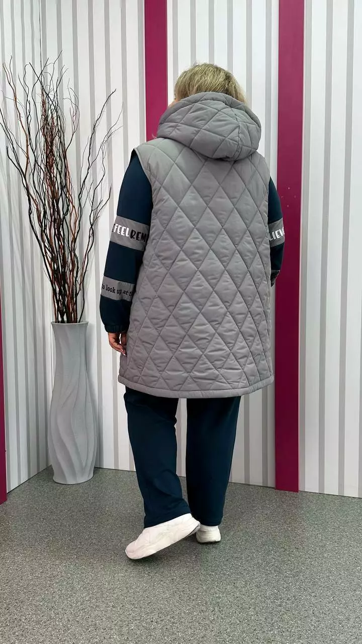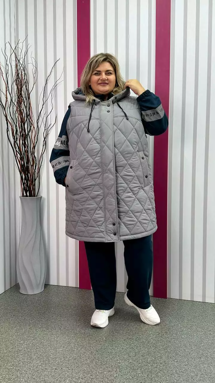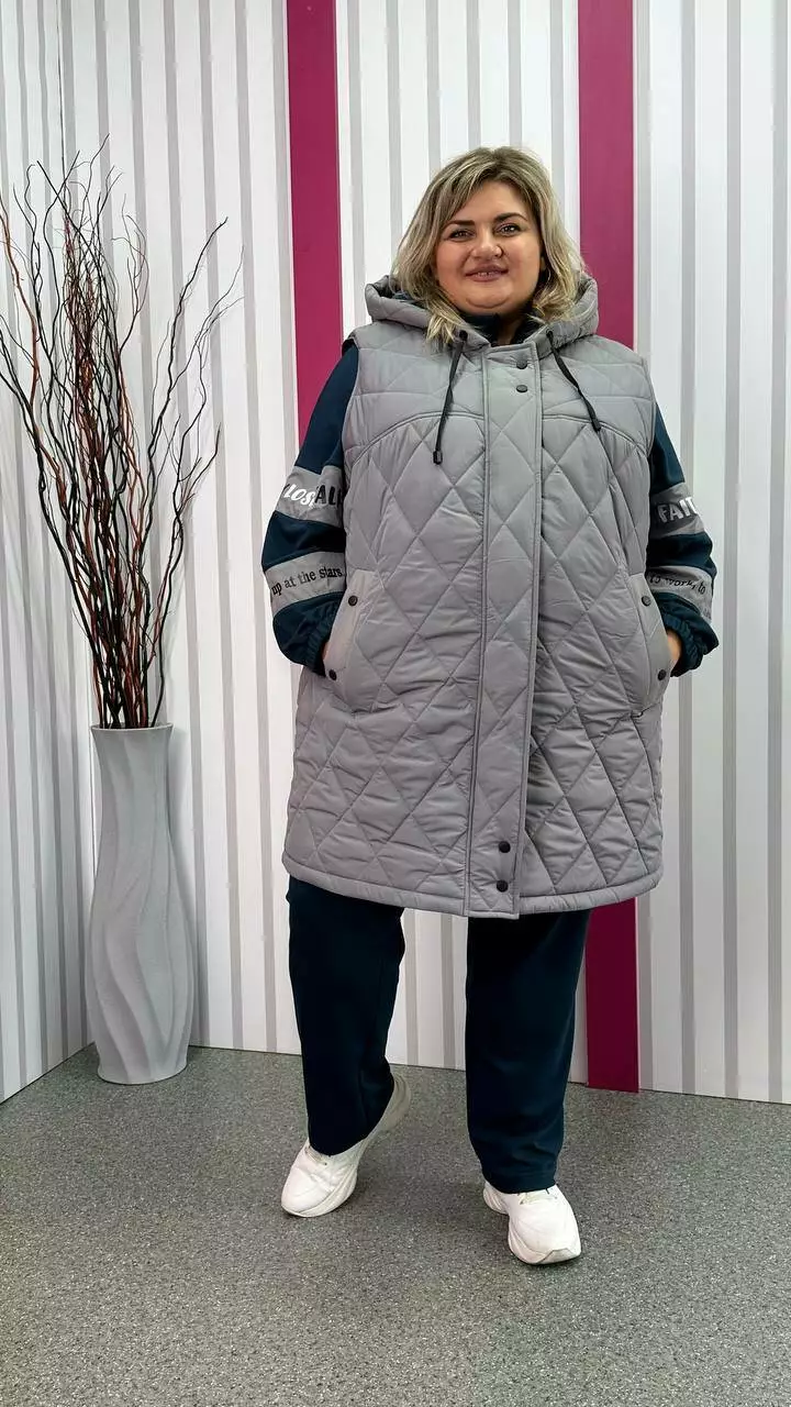 Подовжена тепла жилет зі стьобаної плащівки "Еммі" та "Лаке" наповнення силікон 120. Прикрашений контрастним оздобленням по підборам і середина капюшона. Силует А образний, в кокетку закладена виточка на груди, кишені листочка, планка на кнопках, застібка змійка. М'який, легкий та теплий жилет не пропускає воду та вітер. Посадка ідеальна, зручна пройма, відмінний комплект зі спортивним костюмом.