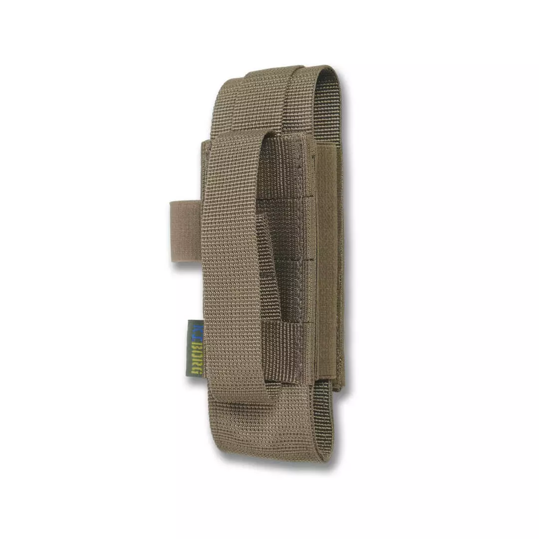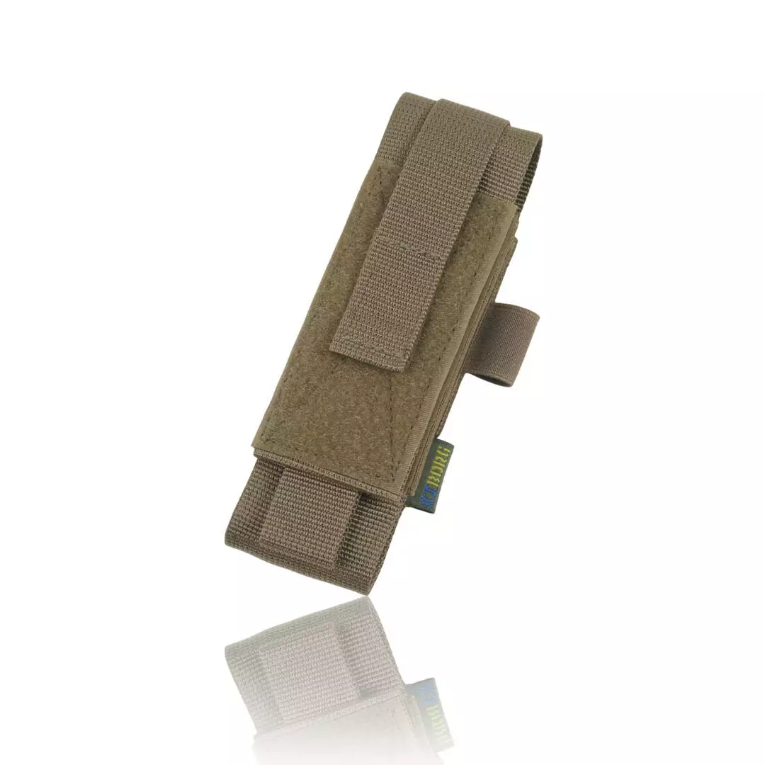 Крепление осуществляется с помощью системы Molle, а также возможность регулировки высоты и глубины с помощью липучек сверху и резинок по бокам. Удобно открывается одной рукой.