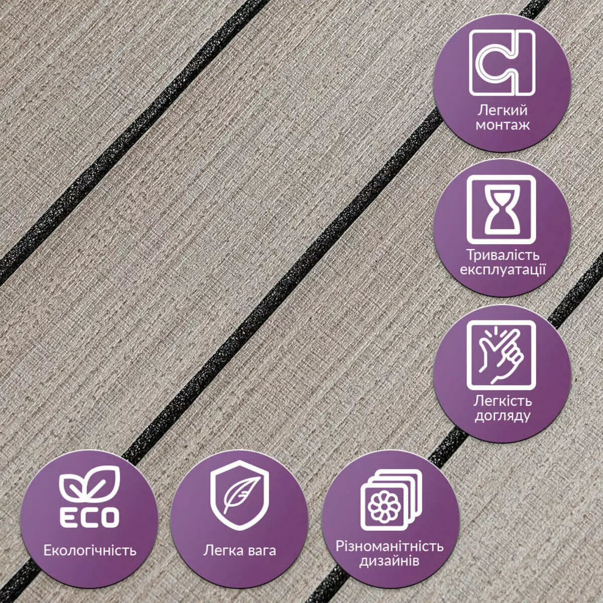 • Легкий догляд: Вінілові рейки легко миються, не вимагають спеціальних засобів для очищення і не вбирають бруд.