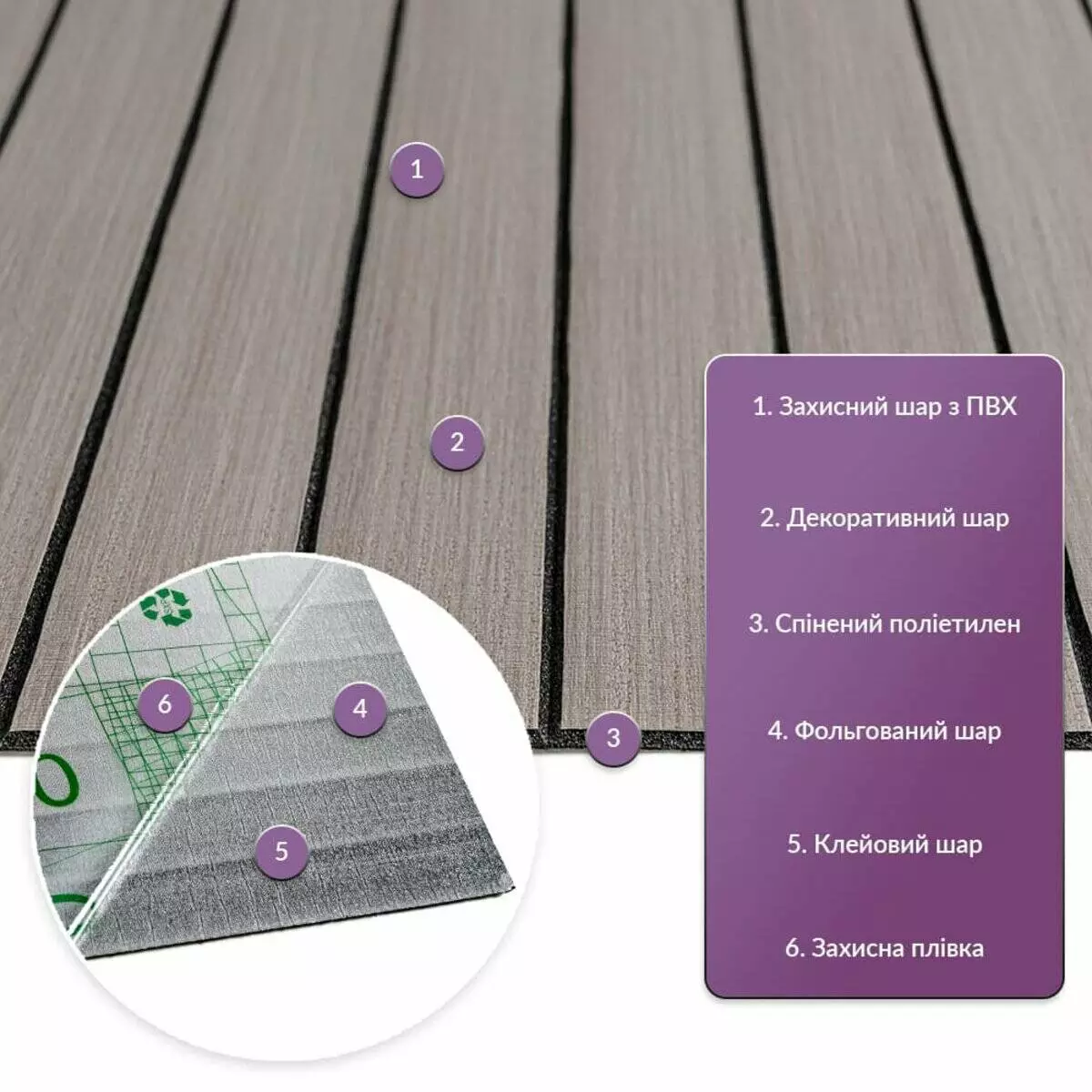 • Декоративний шар: плівка з кольоровим друком високої роздільної якості, яка повністю імітує фактуру природних матеріалів завдяки чіткому та деталізованому зображенню.