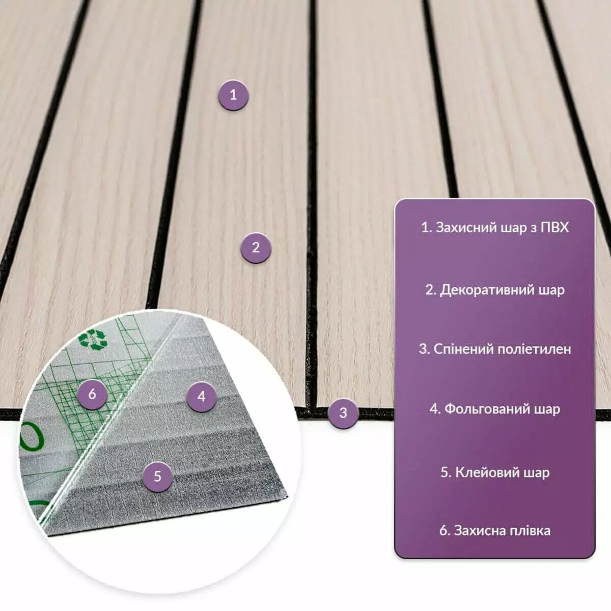 • Декоративний шар: плівка з кольоровим друком високої роздільної якості, яка повністю імітує фактуру природних матеріалів завдяки чіткому та деталізованому зображенню.
