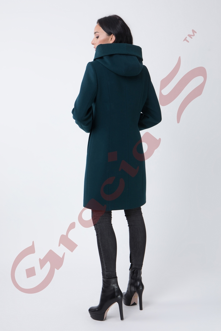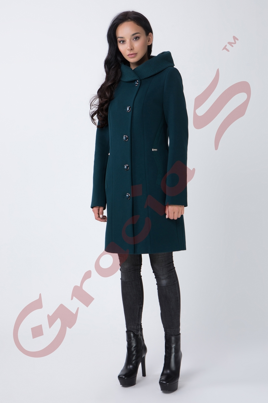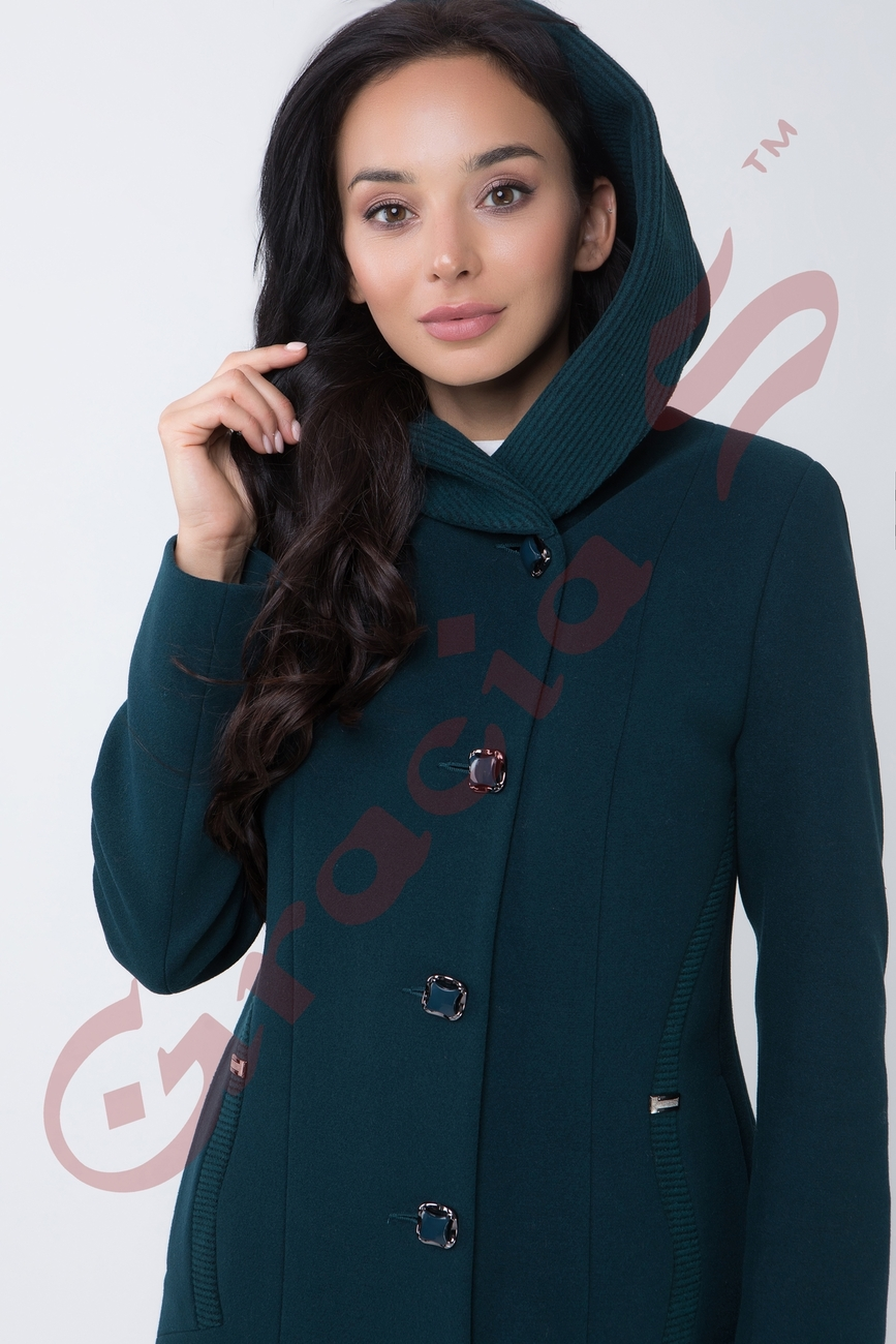 Полуприталенная модель с пришивным капюшоном на пуговицах
