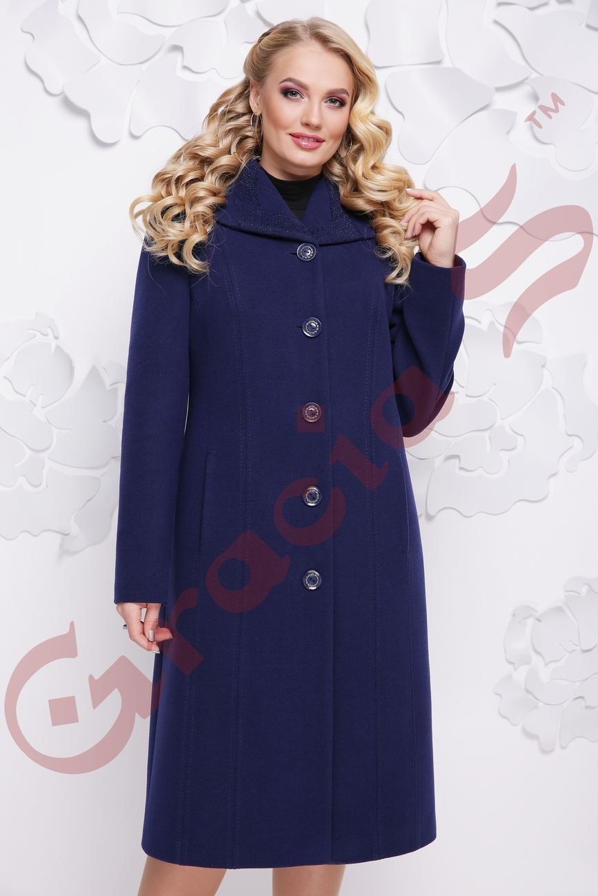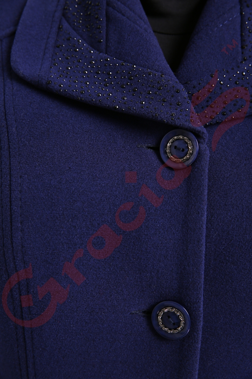Полуприталенное пальто в длине чуть ниже колена с карманами и элегантном воротником, который украшают стразы.