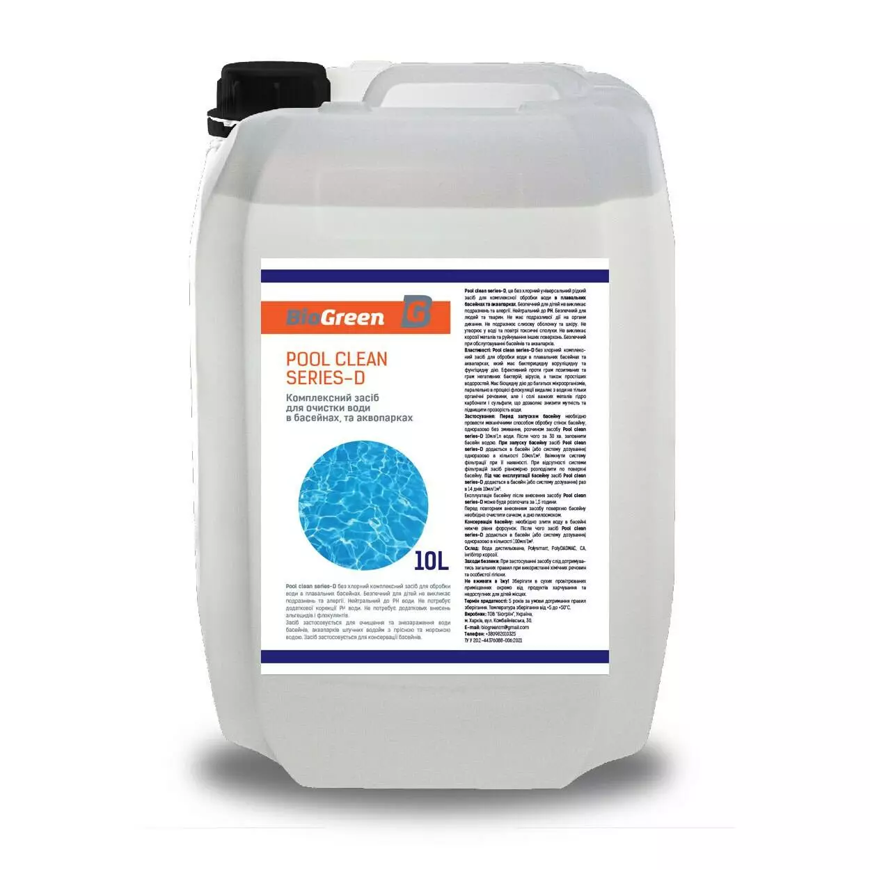 Pool clean series-D, це без хлорний універсальний рідкий засіб для комплексної обробки води в плавальних басейнах та аквапарках. Безпечний для дітей не викликає подразнень та алергії. Нейтральний до РН. Безпечний для людей та тварин. Не має подразливої дії на органи дихання. Не подразнює слизову оболонку та шкіру. Не утворює у воді та повітрі токсичні сполуки. Не викликає корозії металів та руйнування інших поверхонь. Безпечний при обслуговуванні басейнів та аквапарків.