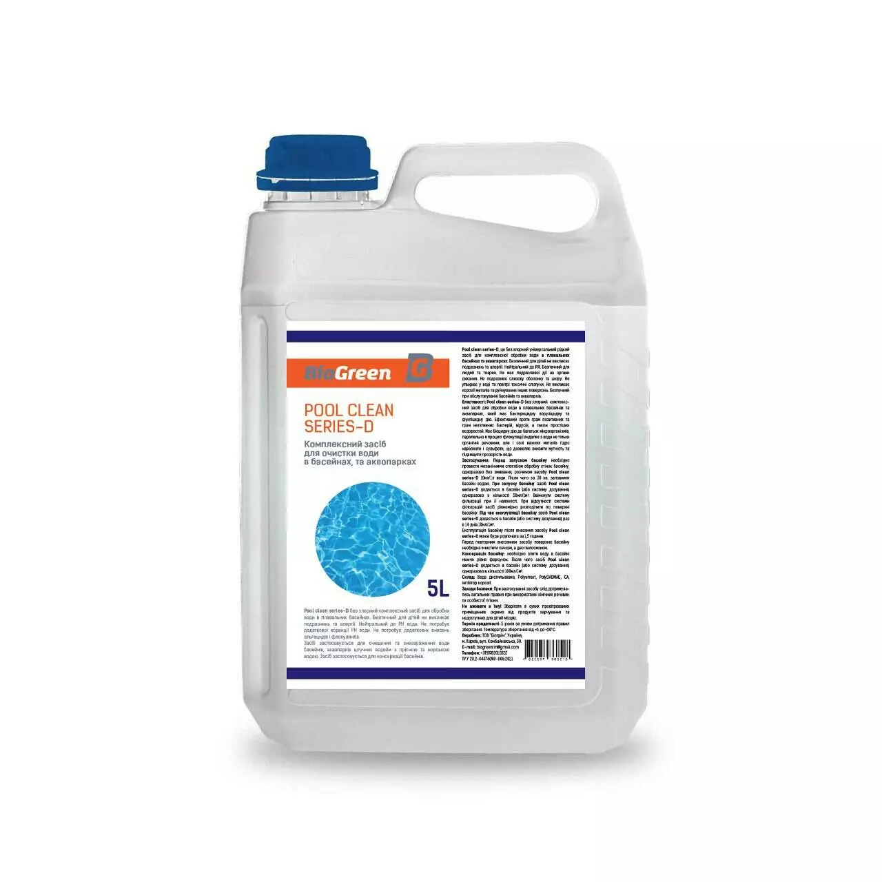 Властивості: Pool clean series-D без хлорний комплексний засіб для обробки води в плавальних басейнах та аквапарках, який має бактерицидну воруліцидну та фунгіцидну дію. Ефективний проти грам позитивних та грам негативних бактерій, вірусів, а також простіших водоростей. Має біоцидну дію до багатьох мікроорганізмів, паралельно в процесі флокуляції видаляє з води не тільки органічні речовини, але і солі важких металів гідро карбонати і сульфати, що дозволяє знизити мутність та підвищити прозорість води.