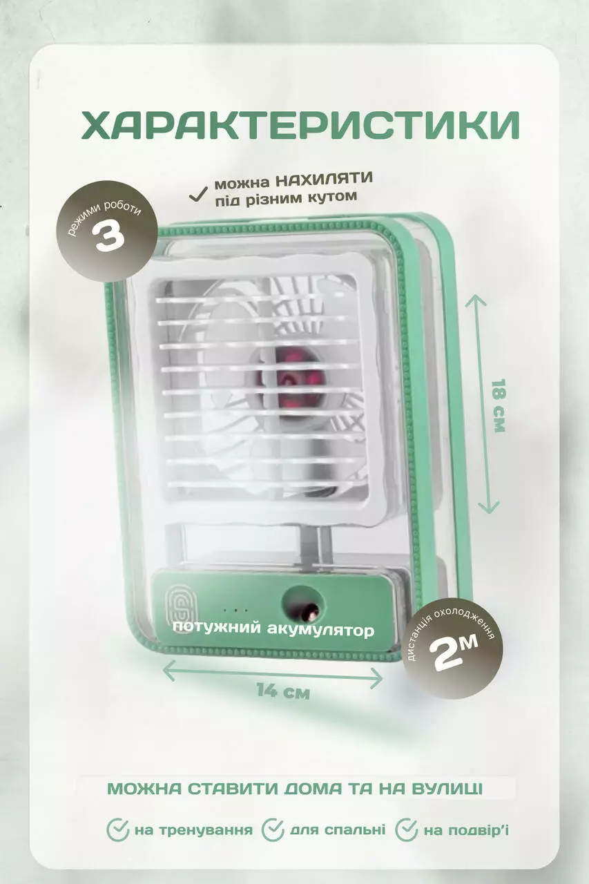 Настольный мини Transparent Spray Light Fan с функциями LED-подсветки и увлажнителя воздуха – ваш идеальный спутник этим знойным летом. С его помощью легко охладиться, создать в зале/спальне комфортную атмосферу, благодаря функции увлажнения и стильной подсветке. Компактный и бесшумный портативный прибор прекрасно впишется в любой интерьер: его легко разместить на прикроватном столике, тумбе, компьютерном столе. Многофункциональность переносного устройства с механическим управлением позволит наслаждаться свежестью и прохладой, становясь стильным акцентом вашего дома!