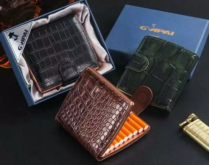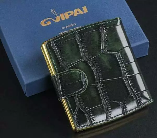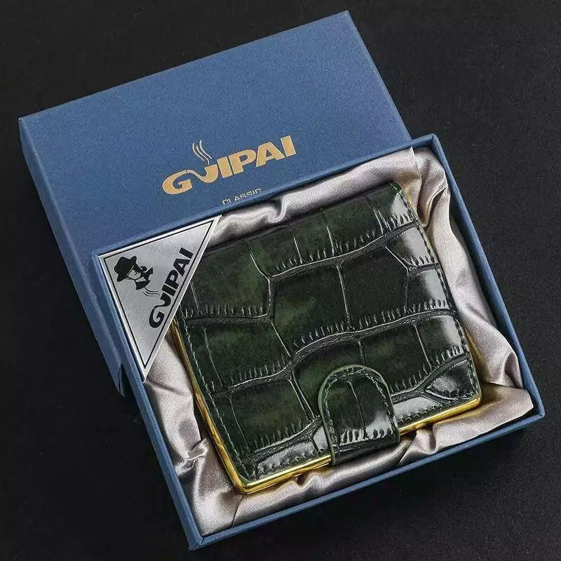 Стильный и практичный портсигар для настоящих ценителей. Корпус выполнен из прочного металла с декоративной обложкой, имитирующей кожу крокодила, в насыщенном зелёном цвете с глянцевым эффектом. Золотистые металлические элементы придают аксессуару роскошный вид. Удобная застёжка надёжно фиксирует крышку.